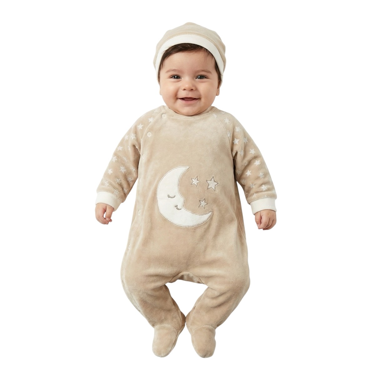 Το βελουτέ φορμάκι της Annora Baby σε μπεζ απόχρωση συνδυάζει την άνεση με τη λειτουργικότητα για τον χειμώνα. Φτιαγμένο από βαμβακερό βελουτέ ύφασμα με σύνθεση 80% βαμβάκι και 20% πολυεστέρα, εξασφαλίζει ζεστασιά και απαλή αίσθηση στο δέρμα του αγοριού σας. Τα απλικέ σχέδια στο εμπρός μέρος προσθέτουν χαρούμενες λεπτομέρειες, ενώ το άνοιγμα με τρουκς από πάνω έως κάτω κάνει το ντύσιμο εύκολο και γρήγορο. Το σετ ολοκληρώνεται με ασορτί σκουφάκι που προστατεύει το μωρό από το κρύο.