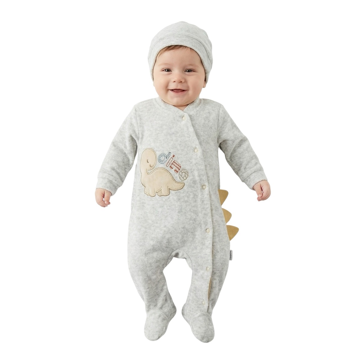 Κλασικό και άνετο, το βελουτέ φορμάκι της Annora Baby σε γκρι απόχρωση είναι μια εξαιρετική χειμερινή επιλογή για το αγοράκι σας. Φτιαγμένο από βελουτέ βαμβακερό ύφασμα με σύνθεση 80% βαμβάκι και 20% πολυεστέρα, προσφέρει ζεστασιά και απαλή αίσθηση. Τα απλικέ σχέδια στο εμπρός μέρος δίνουν μια χαριτωμένη νότα, ενώ το άνοιγμα με τρουκς από πάνω έως κάτω στο πλάι κάνει το ντύσιμο πρακτικό και γρήγορο. Το ασορτί σκουφάκι που συμπληρώνει το σετ κρατά το κεφαλάκι του μωρού ζεστό και προστατευμένο.