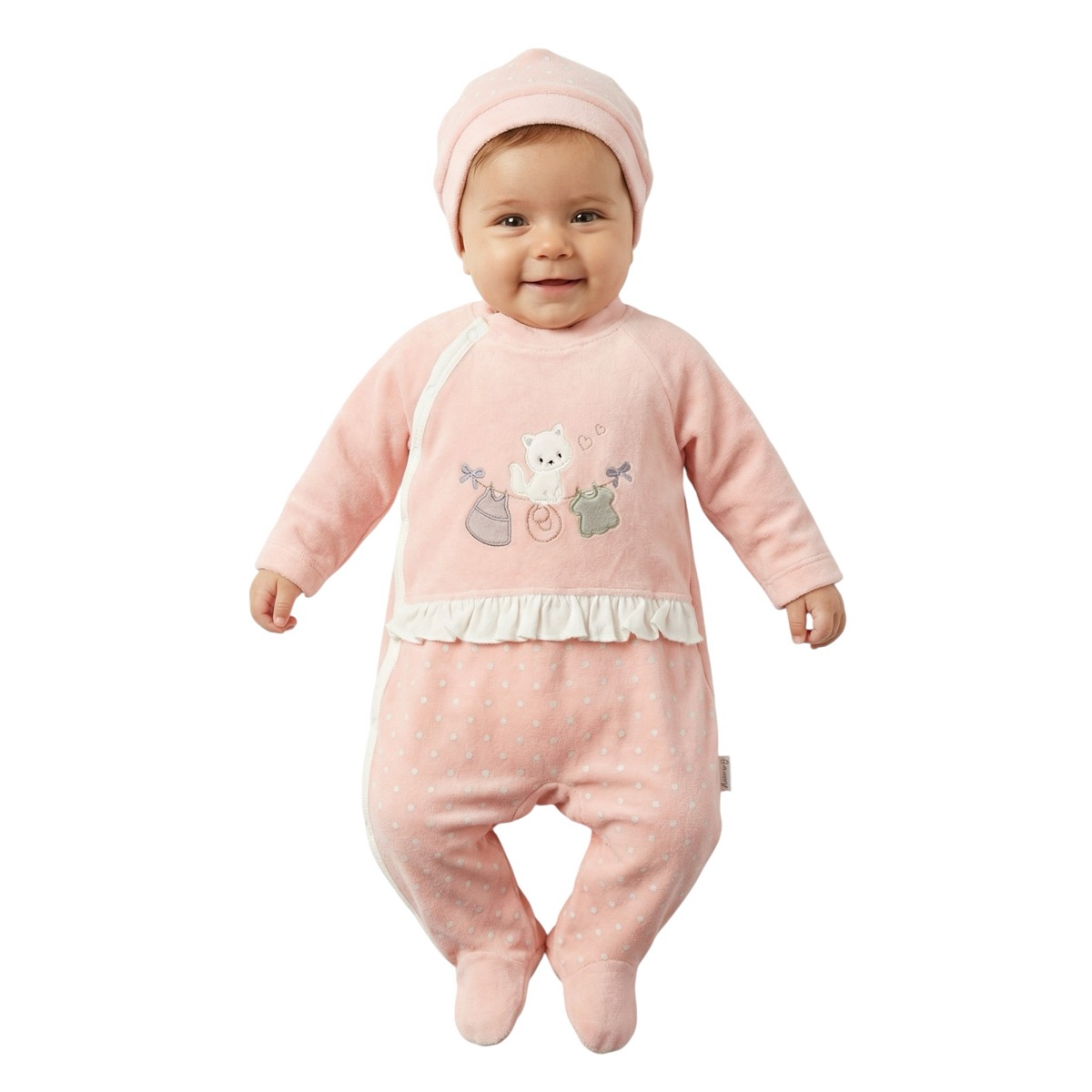 Το ολόσωμο βελουτέ φορμάκι με σκουφάκι Annora Baby σε σομόν χρώμα αποτελεί την ιδανική λύση για τον χειμώνα. Κατασκευασμένο από βελουτέ βαμβακερό ύφασμα με σύνθεση 80% βαμβάκι και 20% πολυεστέρα, προσφέρει τη ζεστασιά και την άνεση που χρειάζεται το μωρό. Τα απλικέ σχέδια στο εμπρός μέρος δίνουν μια γλυκιά νότα, ενώ το άνοιγμα με τρουκς στο πλάι, από τον λαιμό έως κάτω, διευκολύνει σημαντικά το άλλαγμα. Το ασορτί σκουφάκι που το συνοδεύει ολοκληρώνει το σετ και προστατεύει από το κρύο. Ένα χειμωνιάτικο ρούχο για κοριτσάκια που συνδυάζει πρακτικότητα και στιλ, κατάλληλο για την καθημερινότητα αλλά και για δώρο.