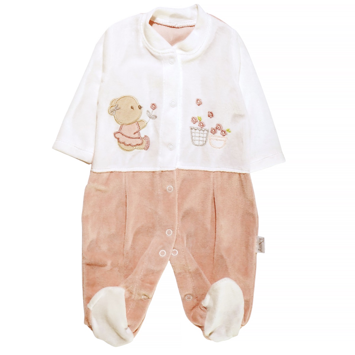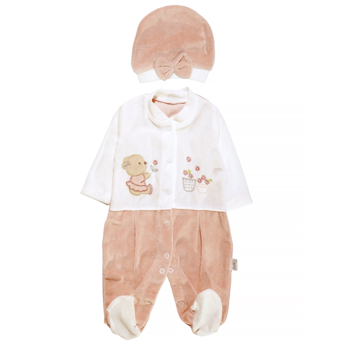 Το ολόσωμο βελουτέ φορμάκι με σκουφάκι Annora Baby σε σομόν χρώμα προσφέρει τη μέγιστη ζεστασιά για τον χειμώνα. Κατασκευασμένο από βελουτέ βαμβακερό ύφασμα με σύνθεση 80% βαμβάκι και 20% πολυεστέρα, χαρίζει άνεση και απαλότητα στο μωρό. Τα απλικέ σχέδια στο εμπρός μέρος προσδίδουν χαριτωμένη και γλυκιά εμφάνιση, ενώ το άνοιγμα με τρουκς από τον λαιμό έως κάτω διευκολύνει το άλλαγμα. Το ασορτί σκουφάκι που το συνοδεύει ολοκληρώνει το σετ και προστατεύει το κεφαλάκι από το κρύο. Ένα χειμωνιάτικο ρούχο σχεδιασμένο για κοριτσάκια, κατάλληλο και ως δώρο.