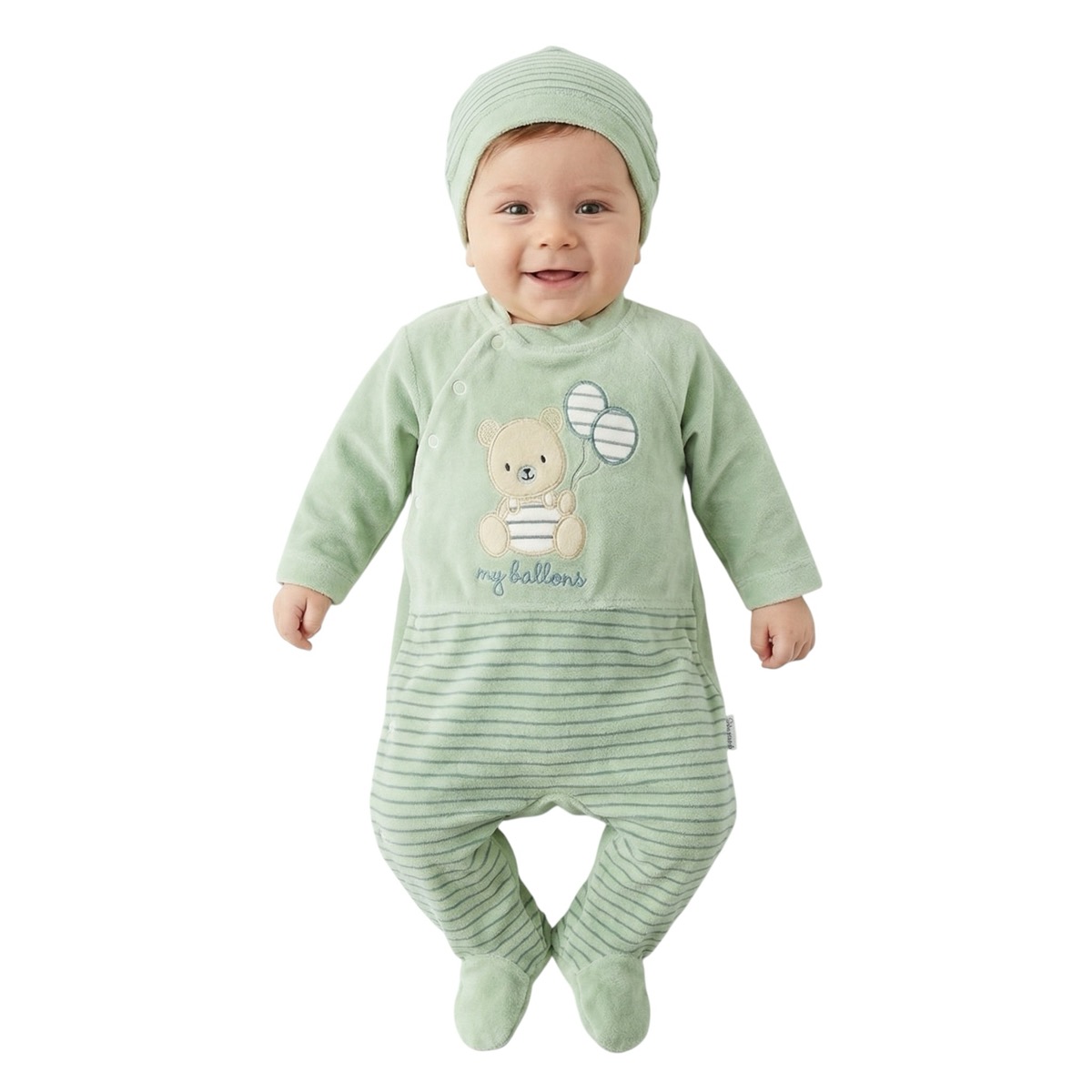 Το ολόσωμο βελουτέ φορμάκι της Annora Baby σε βεραμάν χρώμα είναι μια υπέροχη χειμερινή επιλογή για το αγοράκι σας. Φτιαγμένο από βελουτέ βαμβακερό ύφασμα με σύνθεση 80% βαμβάκι και 20% πολυεστέρα, εξασφαλίζει ζεστασιά και απαλή αίσθηση στο δέρμα του μωρού. Τα απλικέ σχέδια στο εμπρός μέρος προσθέτουν παιχνιδιάρικες λεπτομέρειες, ενώ το άνοιγμα με τρουκς από πάνω έως κάτω στο πλάι κάνει το ντύσιμο και την αλλαγή πιο εύκολα. Το σετ συμπληρώνεται με ασορτί σκουφάκι που προστατεύει το κεφαλάκι από το κρύο.