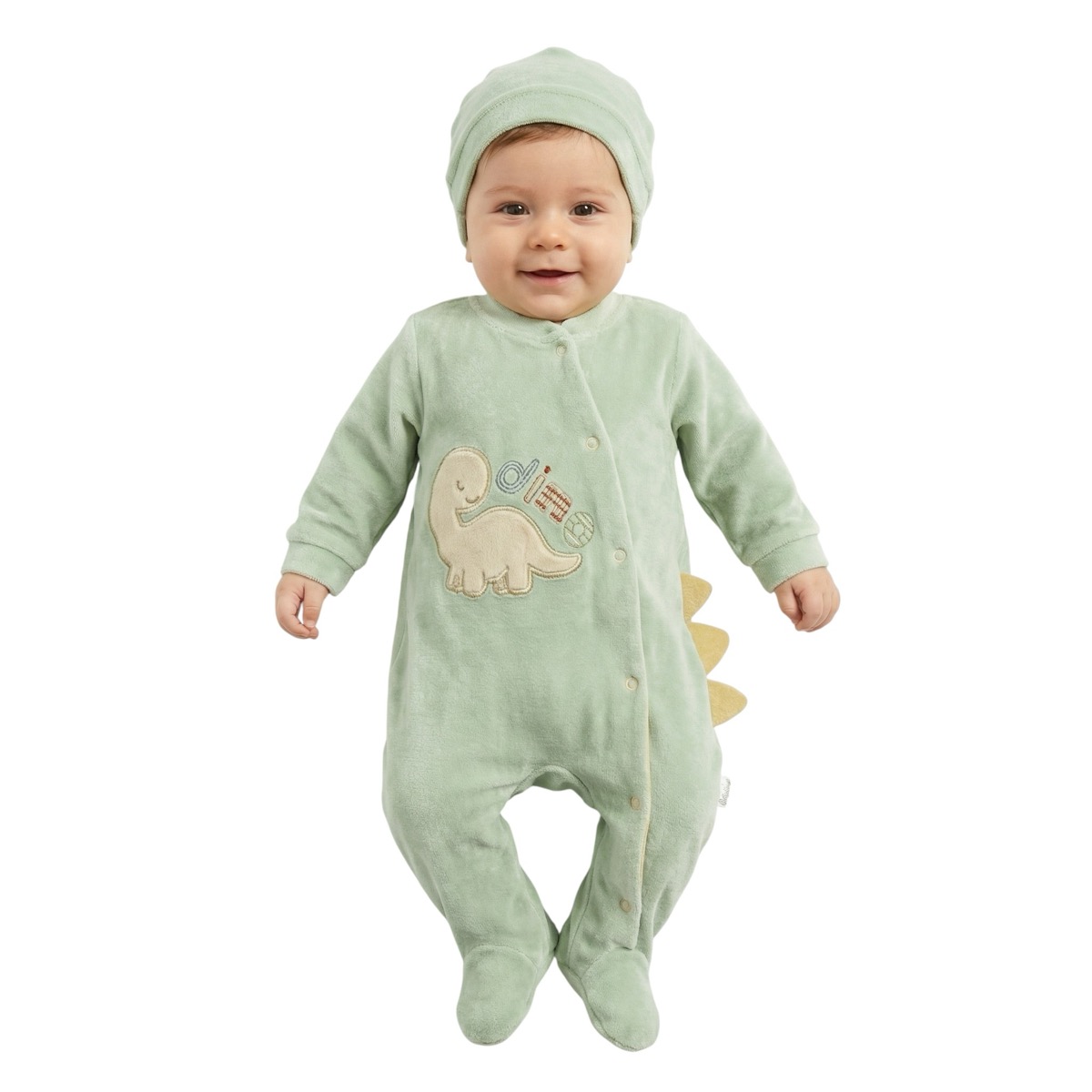Το ολόσωμο βελουτέ φορμάκι της Annora Baby σε βεραμάν χρώμα είναι μια υπέροχη χειμερινή επιλογή για το αγοράκι σας. Φτιαγμένο από βελουτέ βαμβακερό ύφασμα με σύνθεση 80% βαμβάκι και 20% πολυεστέρα, εξασφαλίζει ζεστασιά και απαλή αίσθηση στο δέρμα του μωρού. Τα απλικέ σχέδια στο εμπρός μέρος προσθέτουν παιχνιδιάρικες λεπτομέρειες, ενώ το άνοιγμα με τρουκς από πάνω έως κάτω στο πλάι κάνει το ντύσιμο και την αλλαγή πιο εύκολα. Το σετ συμπληρώνεται με ασορτί σκουφάκι που προστατεύει το κεφαλάκι από το κρύο.