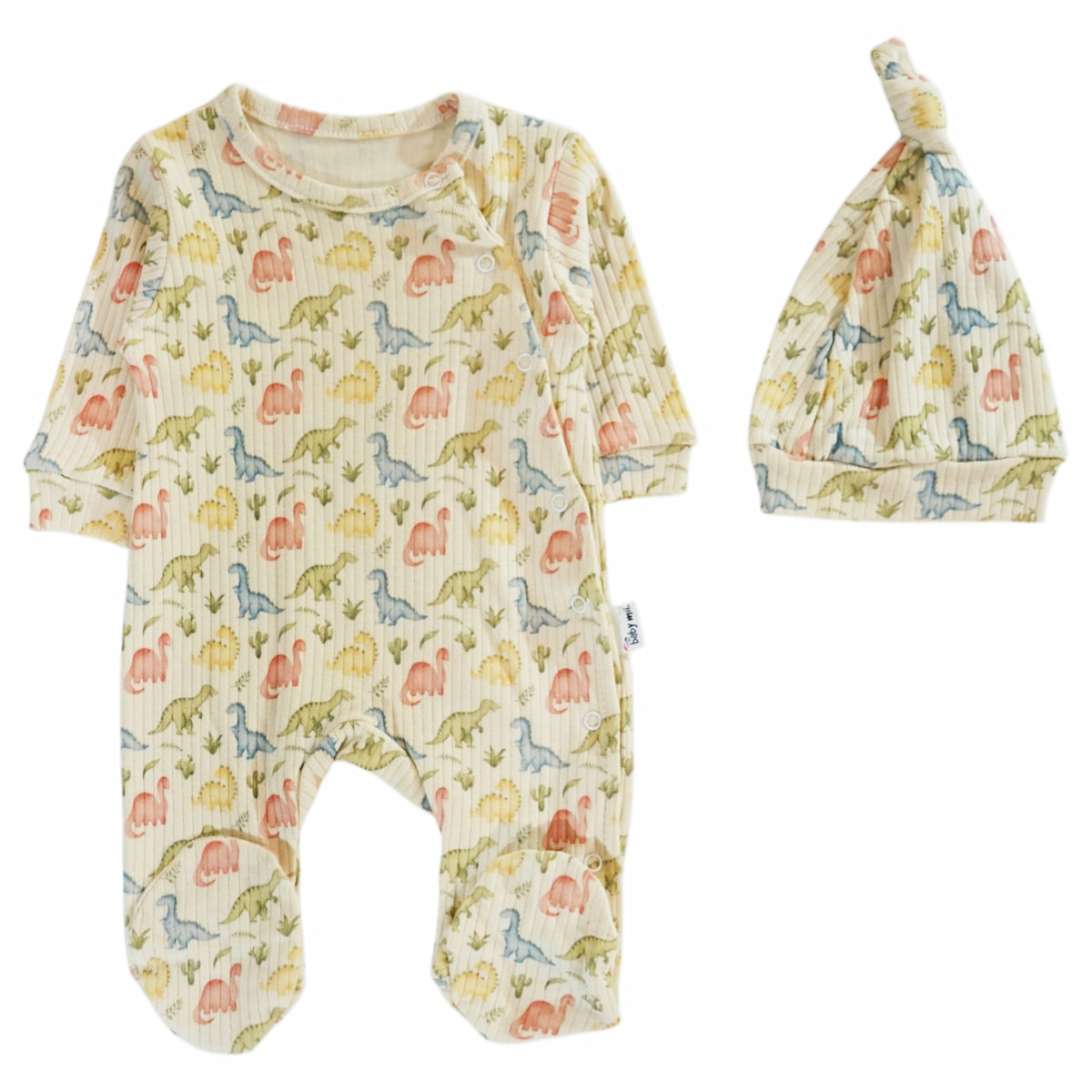 Το λεπτό ολόσωμο φορμάκι με σκουφάκι από τη Baby Mii είναι μια τρυφερή λύση για τα κοριτσάκια σας τις μέρες της άνοιξης και του φθινοπώρου. Το πολύχρωμο τύπωμα με δεινόσαυρους all over δίνει χαρούμενη, παιδική διάθεση, ενώ το σετ ολοκληρώνεται με το ταιριαστό σκουφάκι για έξτρα ζεστασιά στο κεφαλάκι. Είναι φτιαγμένο από 100% βαμβάκι, ώστε να αγκαλιάζει απαλά το δερματάκι του μωρού και να είναι κατάλληλο για καθημερινή χρήση, στο σπίτι ή στη βόλτα. Το άνοιγμα με τρουκς στο πλάι, από τον λαιμό έως κάτω, διευκολύνει πολύ το ντύσιμο και το άλλαγμα, χωρίς να χρειάζεται να περνάει το φορμάκι από το κεφάλι. Ένα πρακτικό και γλυκό σετ που σας βοηθά να έχετε το μωράκι σας άνετο, ντυμένο σωστά και πάντα περιποιημένο.