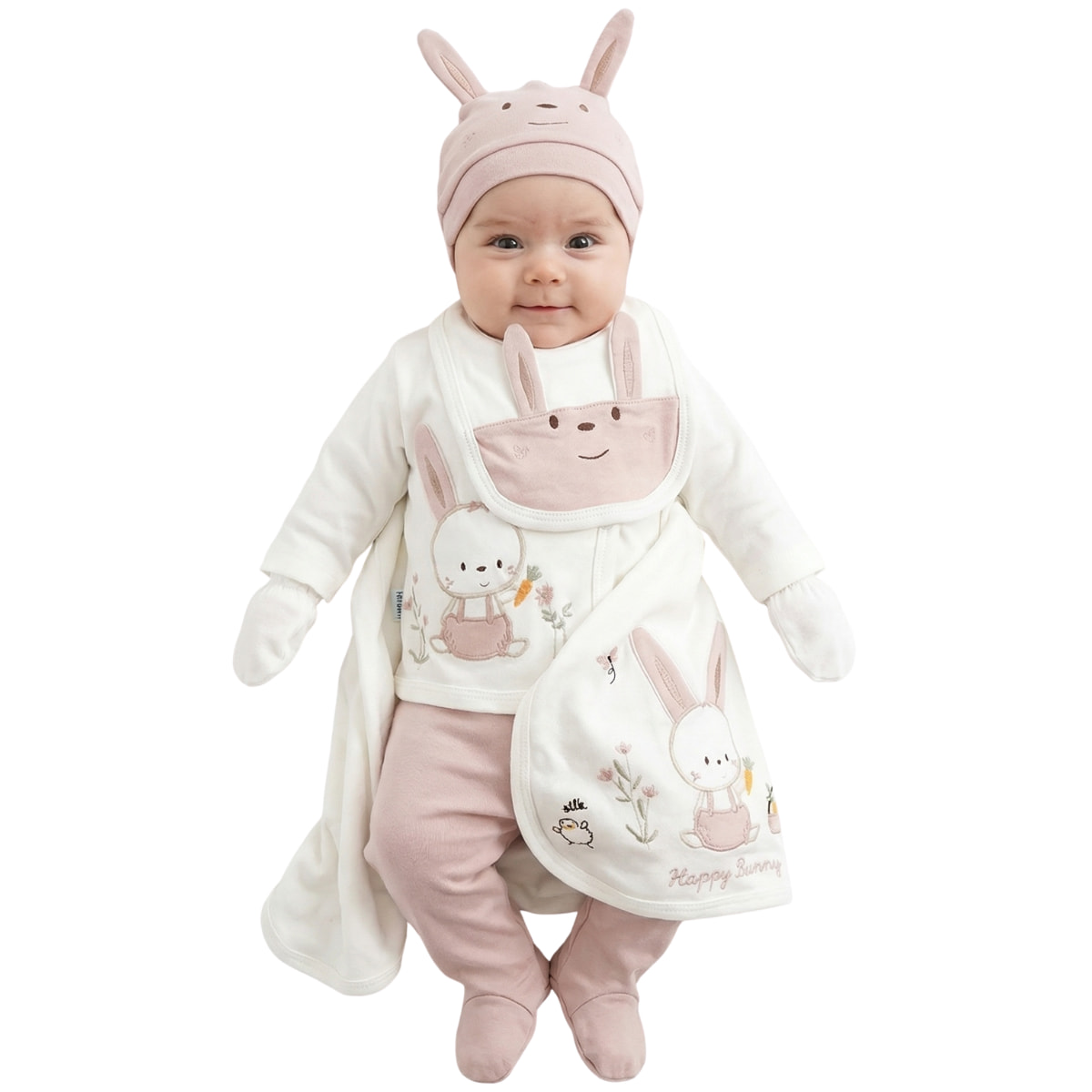 Ένα υπέροχο βρεφικό σετ δέκα τεμαχίων από τη Baby Zuhu αποτελεί την πιο τρυφερή υποδοχή για τα κοριτσάκια σας. Φτιαγμένο αποκλειστικά από 100% βαμβάκι, το λεπτό εκρού ύφασμα δημιουργεί μια φυσική αγκαλιά για το νέο μέλος της οικογένειας. Στη συλλογή πρωταγωνιστούν η πάνα αγκαλιάς και η μακρυμάνικη μπλούζα με το πρακτικό άνοιγμα στο πλάι, οι οποίες αναδεικνύονται μέσα από τα όμορφα απλικέ κεντήματα και το χαριτωμένο λαγουδάκι. Την καθημερινή τους φροντίδα συμπληρώνουν η αμάνικη μπλούζα με τρουκς μπροστά, μια ανοιχτή εσωτερική φανελίτσα και το μακρυμάνικο κορμάκι που κουμπώνει εύκολα στο τελείωμα. Το παντελονάκι διαθέτει κλειστά ποδαράκια για να τις κρατάει πάντα ζεστές και μαλακό λάστιχο στη μέση ώστε να μην τις πιέζει ποτέ. Το ντύσιμο ολοκληρώνεται ιδανικά με την ασορτί σαλιάρα, το σκουφάκι, τη μονόχρωμη λαβέτα και τα απαραίτητα γαντάκια, προσφέροντας στις μικρές σας ένα πραγματικά στιλάτο και άνετο ξεκίνημα.