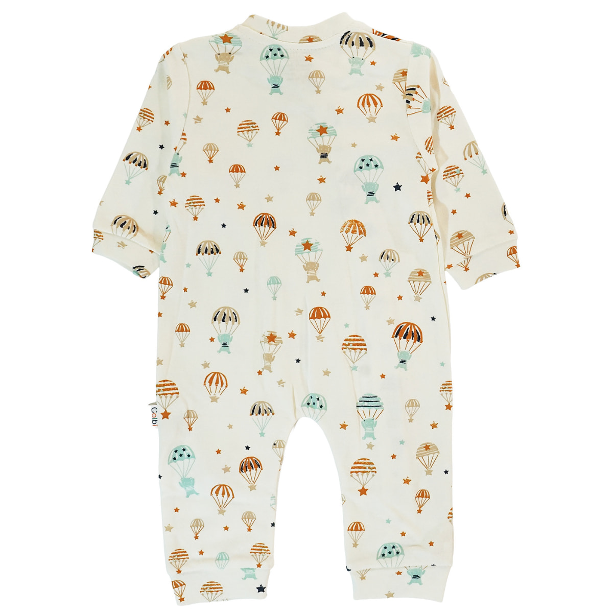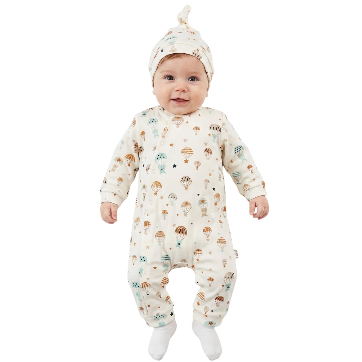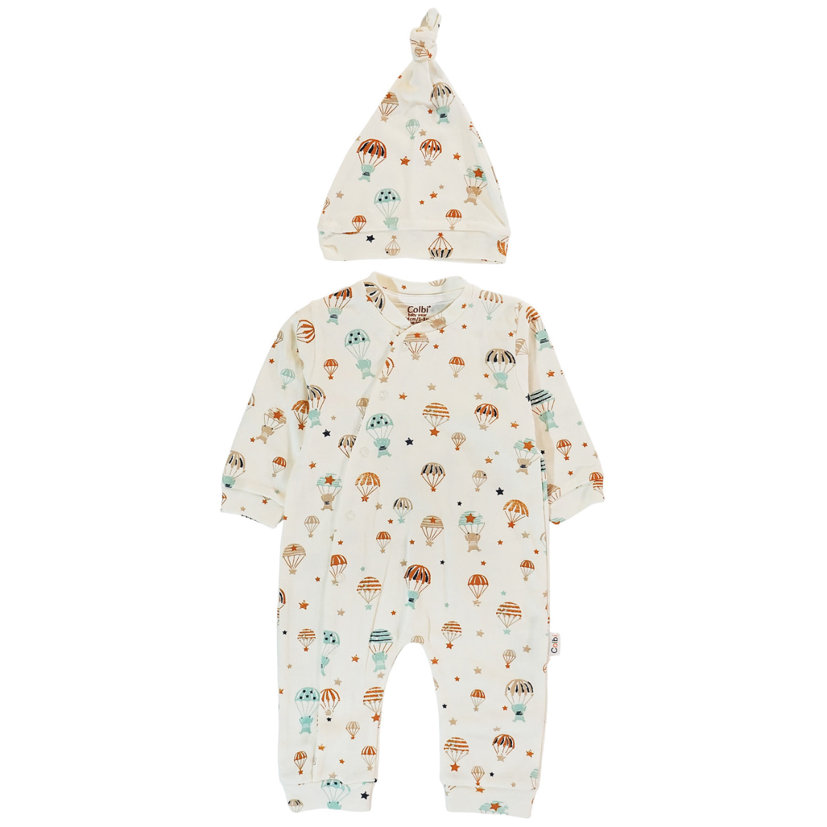 Ένα πανέμορφο φορμάκι από την Colbi υπόσχεται να προσφέρει την πιο γλυκιά αγκαλιά στα αγοράκια σας τις δροσερές μέρες. Το εκρού λεπτό ύφασμα γεμίζει με μικρά αερόστατα σε όλη του την επιφάνεια, δημιουργώντας μια εξαιρετικά τρυφερή εικόνα για τις βόλτες της άνοιξης και του φθινοπώρου. Ο σχεδιασμός του περιλαμβάνει πρακτικά τρουκς στο πλάι που ξεκινούν από τον λαιμό και φτάνουν μέχρι το κάτω μέρος. Αυτή η λεπτομέρεια σας επιτρέπει να αλλάζετε τα ρούχα στη στιγμή, αποφεύγοντας κάθε ταλαιπωρία για τα μωράκια σας. Παράλληλα, το μαλακό λάστιχο στο τελείωμα κρατάει την εφαρμογή σταθερή όσο κουνάνε τα ποδαράκια τους, ενώ το ασορτί σκουφάκι προστατεύει απαλά το κεφαλάκι τους από το αεράκι. Ραμμένο εξ ολοκλήρου από 100% βαμβάκι, σέβεται απόλυτα το ευαίσθητο δερματάκι τους, χαρίζοντας στους μικρούς σας μια πραγματικά στιλάτη και άνετη επιλογή.