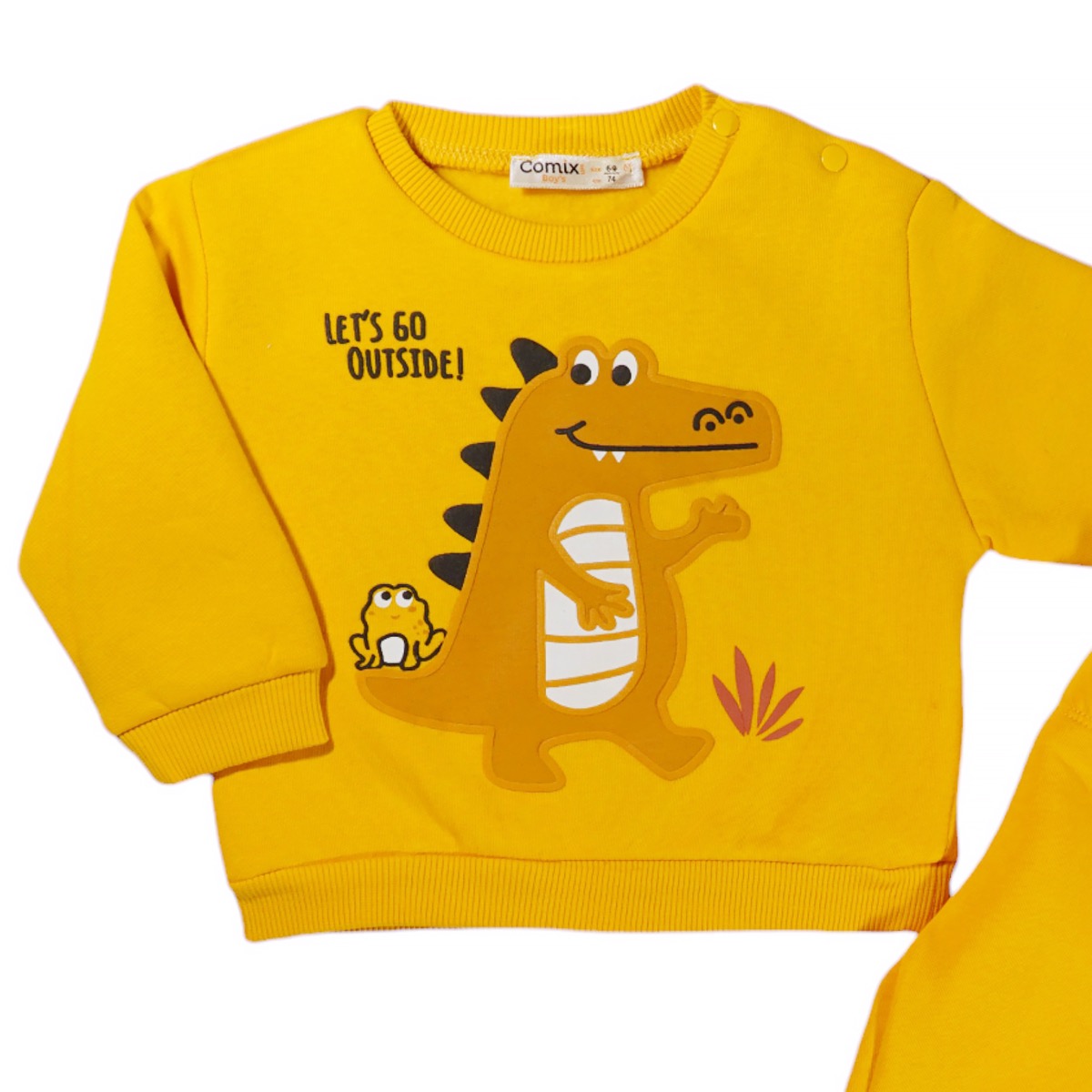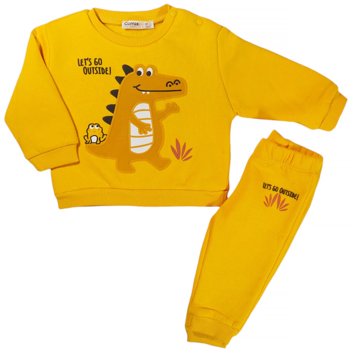 Γνωρίστε το βρεφικό σετ φόρμας από την Comix Life, ιδανικό για τους μικρούς σας ήρωες που βλέπουν τη ζωή με χαρά! Σε φωτεινό κίτρινο χρώμα και φτιαγμένο από 90% βαμβάκι και 10% ελαστάνη, αυτό το σετ θα προσφέρει άνεση και ελευθερία κινήσεων. Η μπλούζα έχει ανάγλυφο σχέδιο στο εμπρός μέρος που ξεχωρίζει, ενώ το πρακτικό άνοιγμα με τρουκς στον ώμο διευκολύνει το ντύσιμο. Το λάστιχο με ριμπ ύφανση στο λαιμό και στα μανίκια συμβάλλει στην τέλεια εφαρμογή, διατηρώντας τον μικρό σας ζεστό τους κρύους καλοκαιρινούς μήνες. Το παντελόνι διαθέτει λάστιχο στη μέση και στο τελείωμα εξασφαλίζοντας άνεση σε κάθε παιχνίδι και δραστηριότητα. Ιδανικό για καθημερινή χρήση, αυτό το σετ φόρμας θα γίνει η αγαπημένη επιλογή για τις εξορμήσεις του!