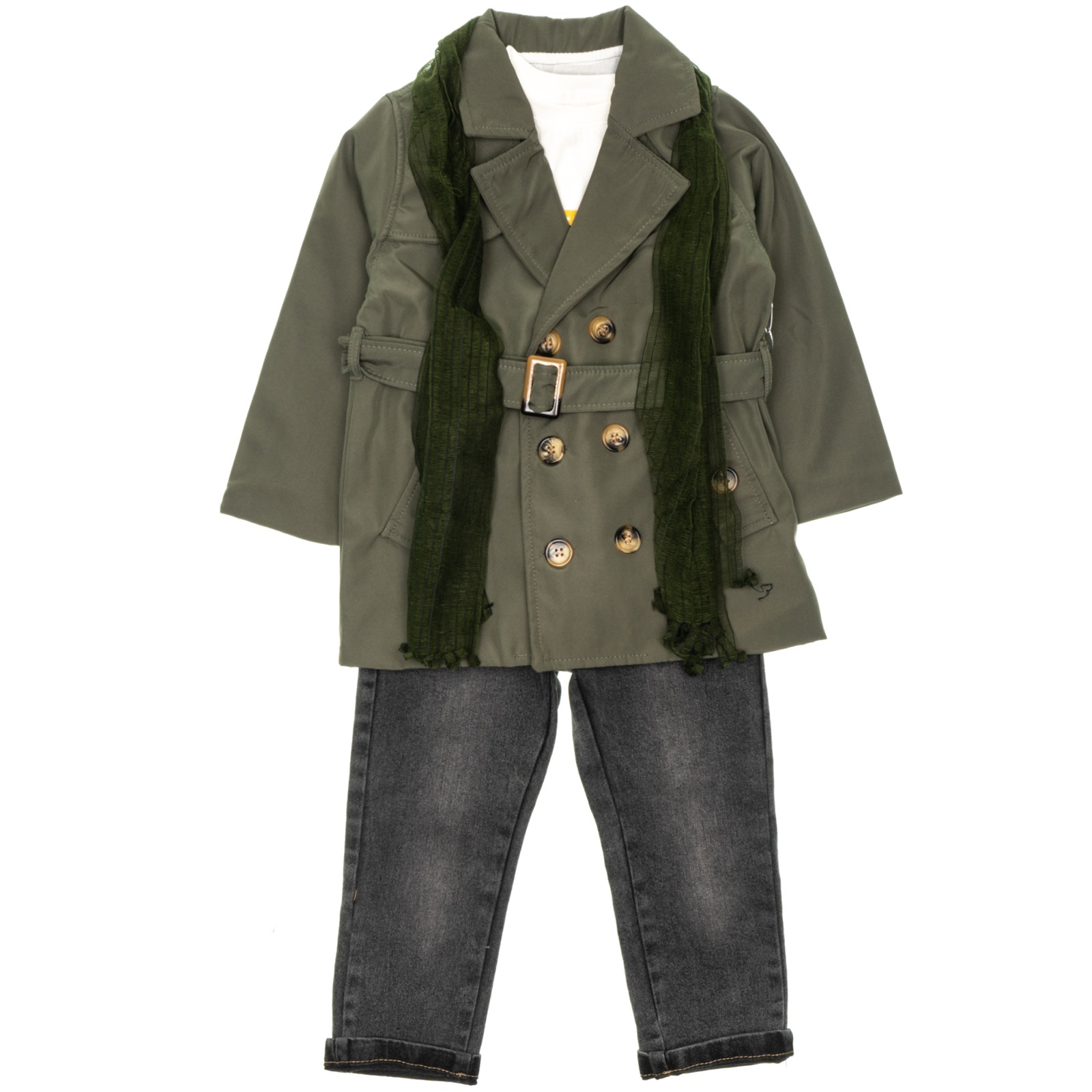Εντυπωσιάστε με το νέο σετ για αγόρια από την Concept Kids, ιδανικό για την άνοιξη και το φθινόπωρο. Αυτό το σετ αποτελείται από μια κομψή πράσινη καμπαρντίνα με κουμπιά και ζώνη, προσφέροντας ένα διαχρονικό στυλ. Το μακρυμάνικο μακό μπλουζάκι με μοντέρνο τύπωμα είναι από 100% βαμβάκι, προσφέροντας άνεση και αντοχή για κάθε περίσταση. Το παντελόνι τζιν, με πρακτικές τσέπες και εύχρηστο κλείσιμο με κουμπί και φερμουάρ, είναι ιδανικό για δραστήρια αγόρια. Το εσωτερικό λάστιχο στη μέση εξασφαλίζει τέλεια εφαρμογή και άνεση. Το σετ ολοκληρώνεται με ένα μπλε φουλάρι, προσδίδοντας μια επιπλέον πινελιά στυλ.