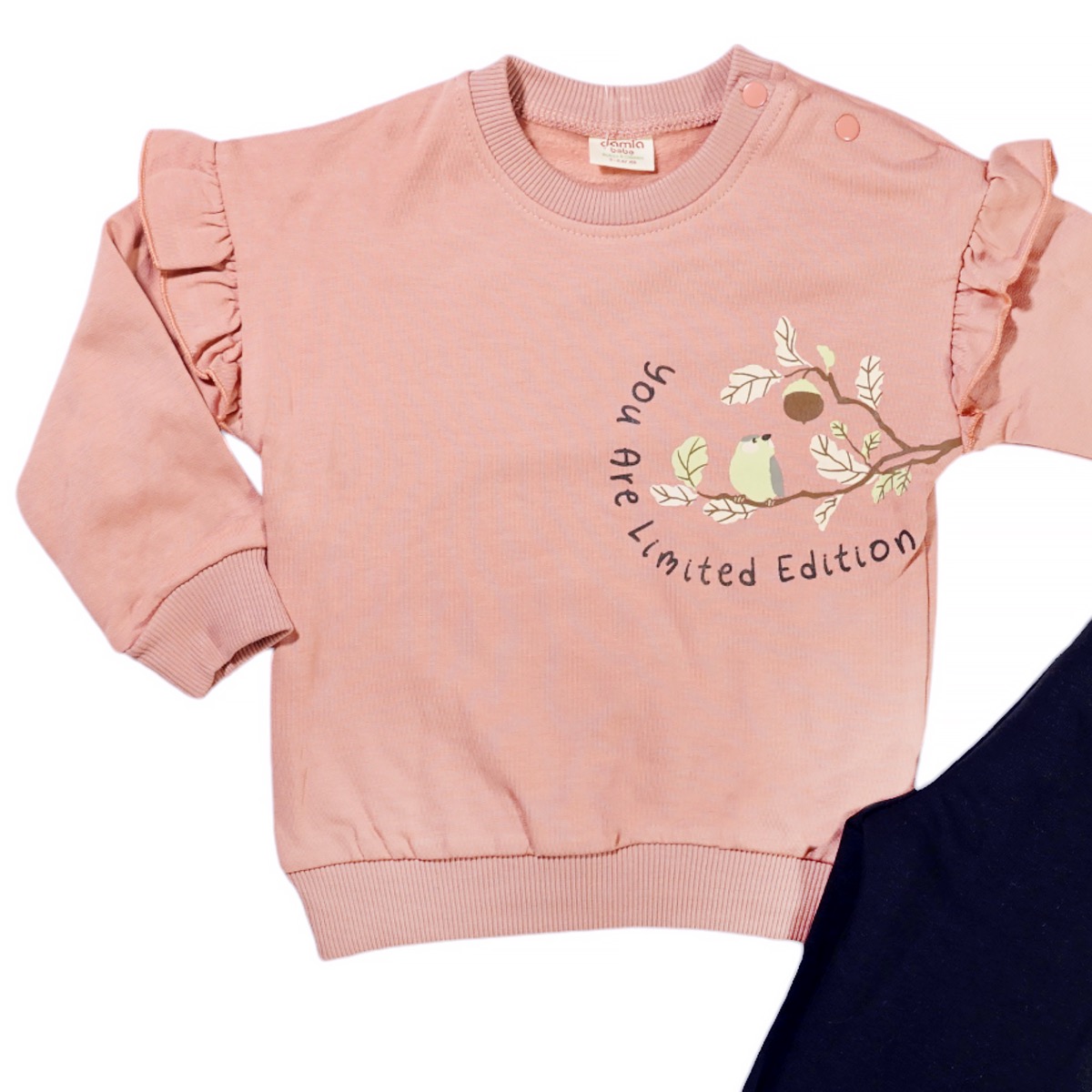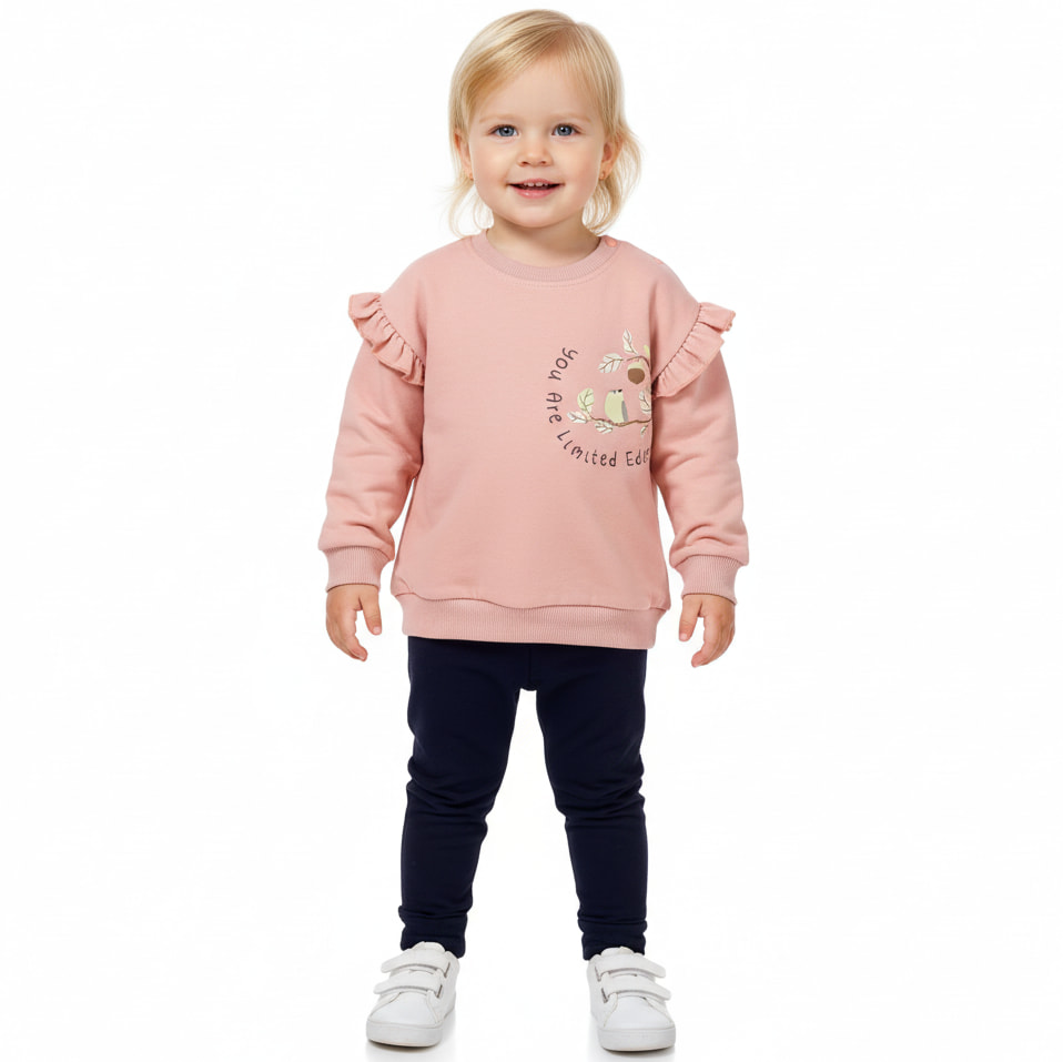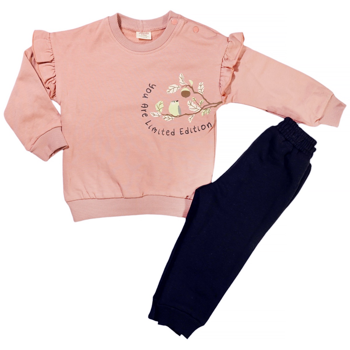 Ανακαλύψτε το σετ φόρμας με χνούδι της Damla Bebe, ιδανικό για τα μωράκια σας που επιθυμείτε να είναι άνετα και με στυλ! Το σετ περιλαμβάνει μια στιλάτη σομόν μπλούζα με τύπωμα στο εμπρός μέρος και πρακτικό άνοιγμα με τρουκ στο λαιμό, διευκολύνοντας την καθημερινή χρήση. Η μπλούζα διαθέτει λάστιχο με ριμπ ύφανση στο λαιμό, στα μανίκια και περιμετρικά στο κάτω μέρος, προσφέροντας μια τέλεια εφαρμογή. Το παντελόνι σε μαύρο χρώμα διαθέτει λάστιχο στη μέση και στο τελείωμα, διασφαλίζοντας άνεση και ελευθερία κινήσεων. Κατασκευασμένο από 100% βαμβάκι, το σετ είναι ιδανικό για τον χειμώνα, εξασφαλίζοντας ζεστασιά κατά την καθημερινή χρήση. Επιλέξτε αυτό το σετ για να κρατήσετε τη μικρή σας κομψή και άνετη σε κάθε της εμφάνιση!