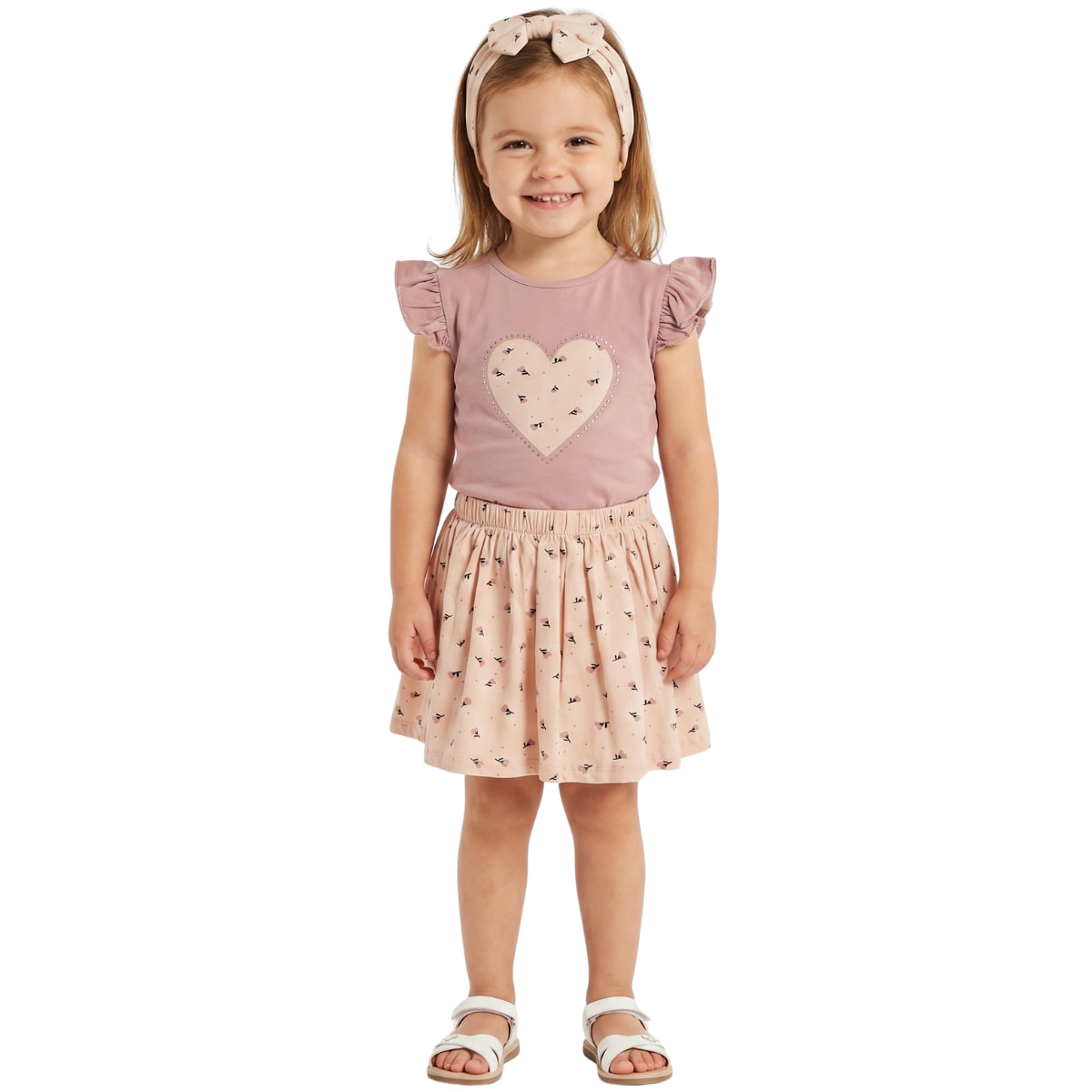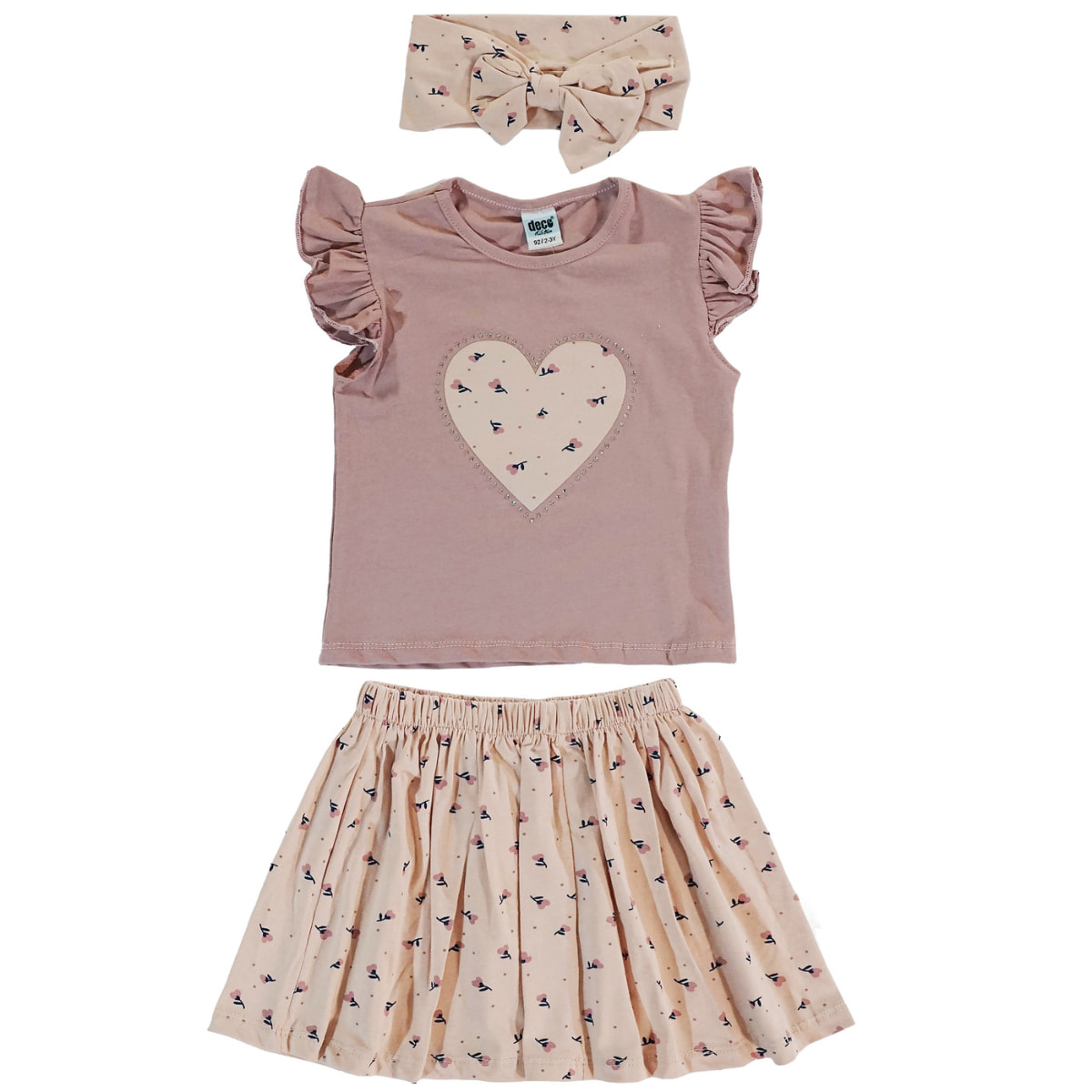Το σετ από τη Deco Kids είναι μια αληθινή αγκαλιά τρυφερότητας και στιλ για τις πιο γλυκές καλοκαιρινές εμφανίσεις των κοριτσιών σας. Το σομόν μπλουζάκι κλέβει τις καρδιές με το υπέροχο τύπωμα μιας μεγάλης καρδιάς στο μπροστινό μέρος, το οποίο στολίζεται με λαμπερά στρασάκια, προσθέτοντας μια αίσθηση μαγείας και χαράς. Συνδυάζεται μοναδικά με την πανέμορφη φουστίτσα, η οποία ξεχωρίζει χάρη στο ρομαντικό μοτίβο με τα λουλουδάκια που απλώνεται σε όλη την επιφάνειά της. Το μαλακό λάστιχο περιμετρικά στη μέση προσφέρει στη μικρή σας την ελευθερία να παίζει, να τρέχει και να χορεύει χωρίς καμία πίεση. Για να ολοκληρωθεί αυτή η παραμυθένια εικόνα, το σετ συνοδεύεται από μια ασορτί κορδέλα για τα μαλλιά που θα κάνει τη μικρή σας πριγκίπισσα να λάμπει σε κάθε της βόλτα. Με σύνθεση 95% βαμβάκι και 5% ελαστάνη, το ύφασμα αγκαλιάζει απαλά το δέρμα της, χαρίζοντας ελαστικότητα και δροσιά τις ζεστές ημέρες.
