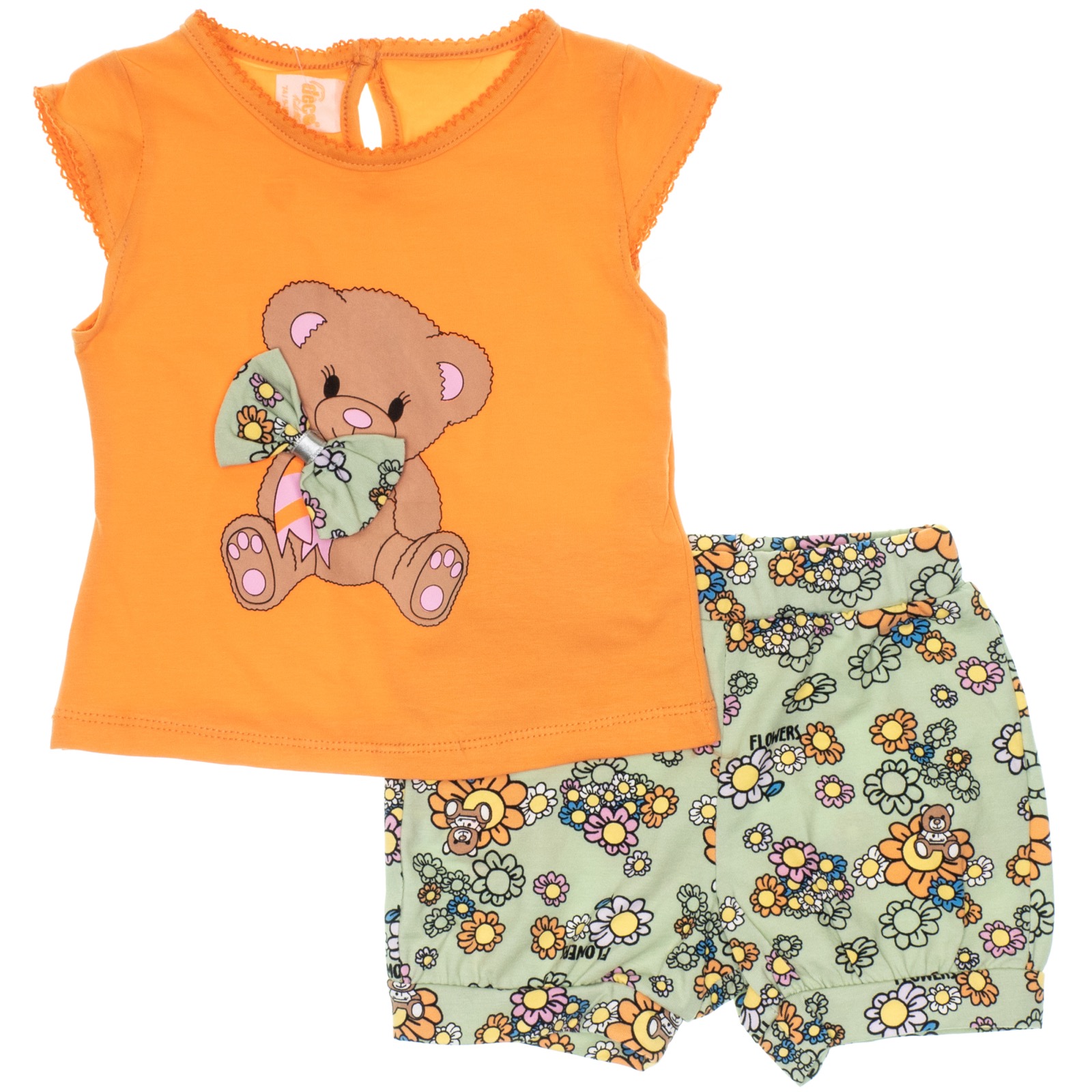 Ανακαλύψτε το εντυπωσιακό σετ της Deco για κοριτσάκια, ιδανικό για κάθε μέρα! Το σετ περιλαμβάνει ένα αμάνικο πορτοκαλί μπλουζάκι με χαριτωμένο τύπωμα και φιόγκο στο εμπρός μέρος, προσθέτοντας μια παιχνιδιάρικη και κομψή πινελιά. Το μπλουζάκι διαθέτει άνοιγμα με κουμπί στο πίσω μέρος για εύκολη εφαρμογή και αφαίρεση. Το πράσινο σορτσάκι έχει λάστιχο περιμετρικά στη μέση, προσφέροντας άνεση και σταθερότητα κατά την κίνηση. Κατασκευασμένο από 95% βαμβάκι και 5% ελαστάνη, το σετ αυτό είναι απαλό, ελαστικό και φιλικό προς το δέρμα, ιδανικό για τις καθημερινές δραστηριότητες των μικρών μας.