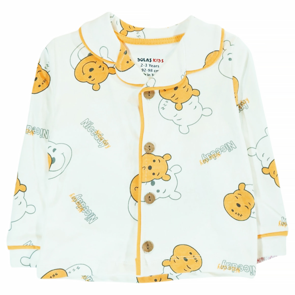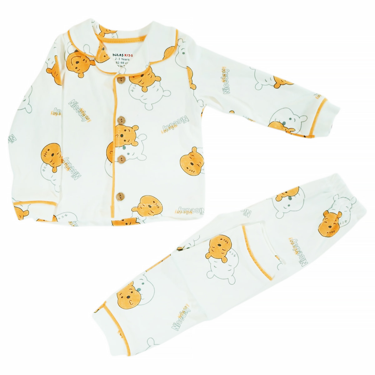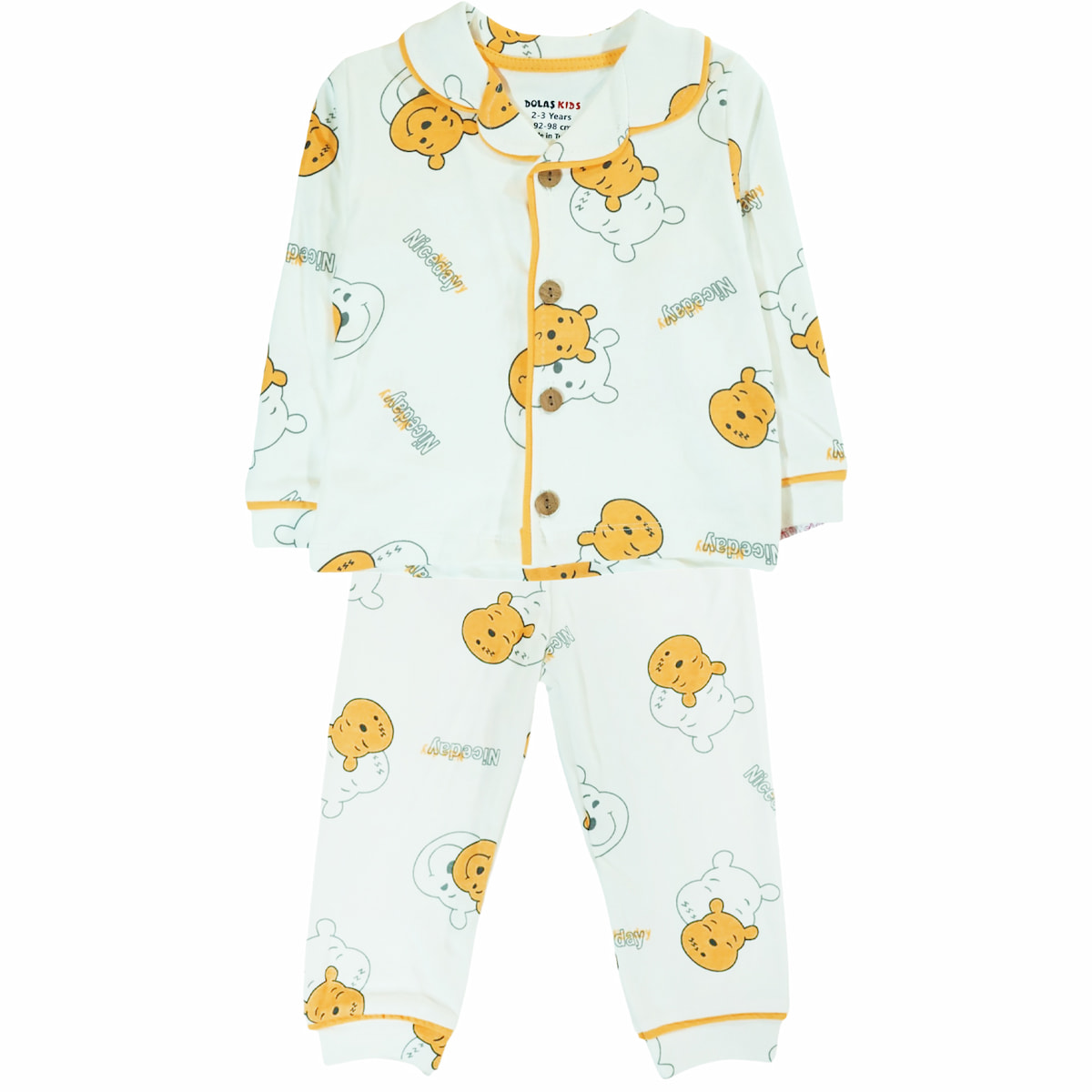 Η πιτζαμούλα από τη Dolas Kids είναι η ιδανική συντροφιά για τα γλυκά όνειρα που θα κάνουν τα αγοράκια σας την άνοιξη και το φθινόπωρο. Η απαλή εκρού βάση της φιλοξενεί ένα χαρούμενο σχέδιο με αρκουδάκια σε όλη την επιφάνεια, προσδίδοντας μια τρυφερή και παιχνιδιάρικη νότα στην ώρα του ύπνου. Η μακρυμάνικη μπλούζα διαθέτει άνοιγμα με κουμπιά στο μπροστινό μέρος, κάνοντας την προετοιμασία για το κρεβάτι μια εύκολη και γρήγορη διαδικασία για εσάς. Το παντελόνι του σετ έχει λάστιχο περιμετρικά στη μέση για να εφαρμόζει σωστά χωρίς να σφίγγει, επιτρέποντας στο παιδί να κοιμάται άνετα. Κατασκευασμένη εξ ολοκλήρου από 100% βαμβάκι, προσφέρει τη φυσική απαλότητα και τη φροντίδα που χρειάζεται το ευαίσθητο δέρμα τους για να χαλαρώσει και να ξεκουραστεί.