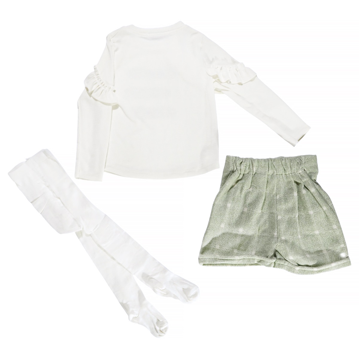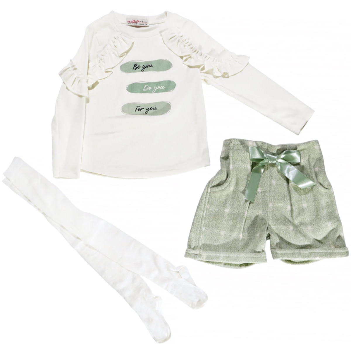 Το σετ της Ecolkiz είναι η ιδανική επιλογή για τη χειμερινή γκαρνταρόμπα της κόρης σας. Περιλαμβάνει μια όμορφη μπλούζα σε εκρού απόχρωση με τύπωμα και βολάν στο εμπρός μέρος, ένα άνετο σορτσάκι από ύφασμα τύπου φανέλα με τσέπες και λάστιχο στη μέση σε βεραμάν χρώμα, καθώς και ένα πρακτικό καλσόν. Η μπλούζα είναι κατασκευασμένη από 70% βαμβάκι και 30% πολυεστέρα, το σορτς από 100% βαμβάκι και το καλσόν από 73% βαμβάκι, 24% πολυεστέρας και 3% ελαστάνη. Το λεπτό βαμβακερό ύφασμα της μπλούζας προσφέρει άνεση, ενώ το σορτσάκι με τις λειτουργικές τσέπες συνδυάζει πρακτικότητα και στιλ. Ένα ολοκληρωμένο σετ που θα λατρέψει η μικρή σας για καθημερινές εμφανίσεις με χαρά και άνεση.