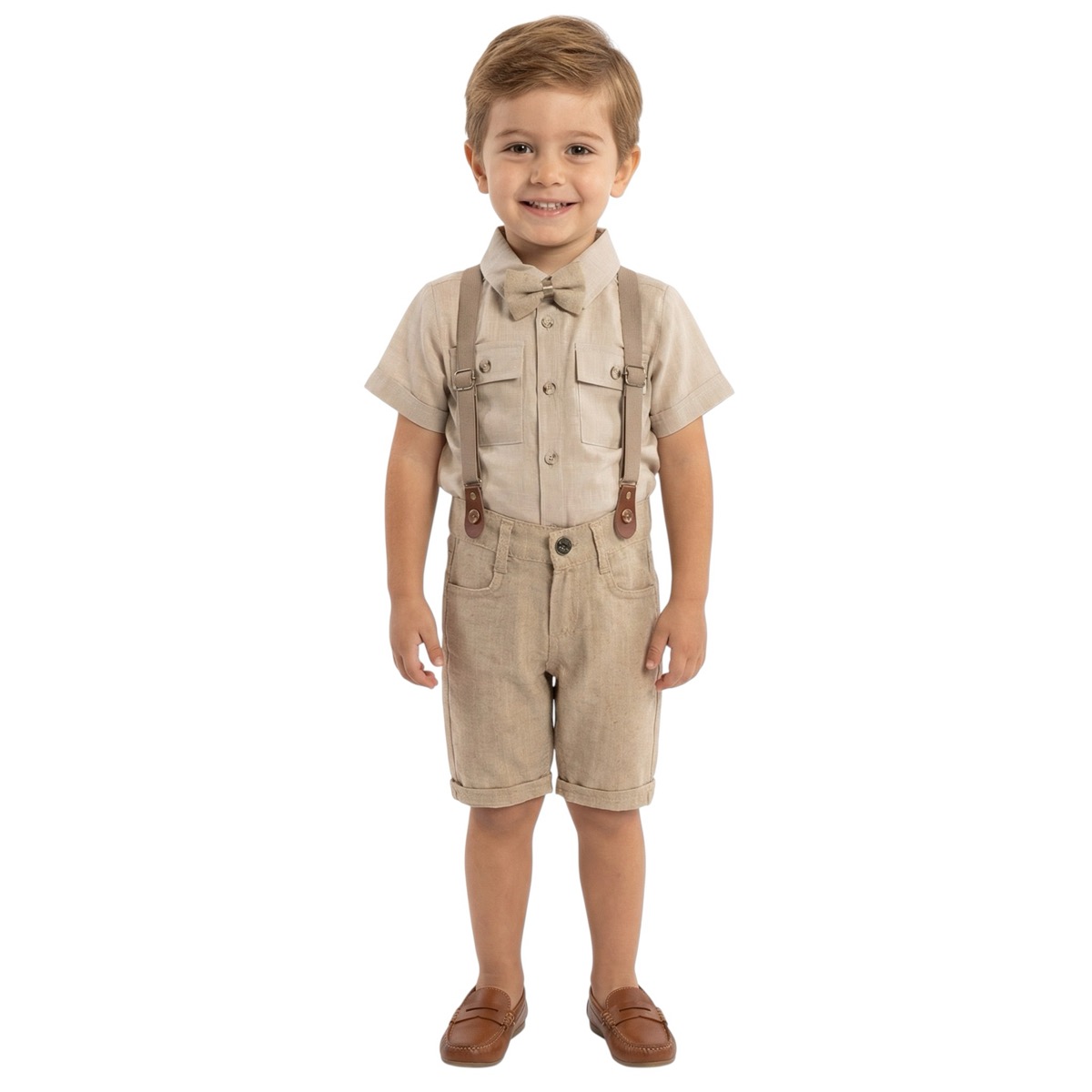 Ανανεώστε τη γκαρνταρόμπα του μικρού σας με το σοφιστικέ σετ από την Ecoo Kids, τέλειο για εκδηλώσεις όπου απαιτείται μια επίσημη εμφάνιση. Το κοντομάνικο πουκάμισο σε μπεζ χρώμα διακοσμείται με τσέπες, προσθέτοντας μια ζωντανή και παιχνιδιάρικη ατμόσφαιρα. Συνοδεύεται από ένα στιλάτο παπιγιόν με λάστιχο για εύκολη εφαρμογή, καθώς και από μια βερμούδα με πρακτικές τσέπες εμπρός και πίσω. Η βερμούδα κλείνει με κουμπί και φερμουάρ, διαθέτει επίσης εσωτερικό λάστιχο για τη ρύθμιση της μέσης, εξασφαλίζοντας άνεση και καλή εφαρμογή καθώς το παιδί αναπτύσσεται. Τιράντες που συνδέονται με κουμπιά ενισχύουν την εμφάνιση, κάνοντας το σετ ιδανικό για πάρτι, βαπτίσεις, γάμους και άλλες ιδιαίτερες στιγμές. Το ύφασμα από 100% βαμβάκι προσφέρει την απαραίτητη ελαστικότητα και ανθεκτικότητα για συχνή χρήση.