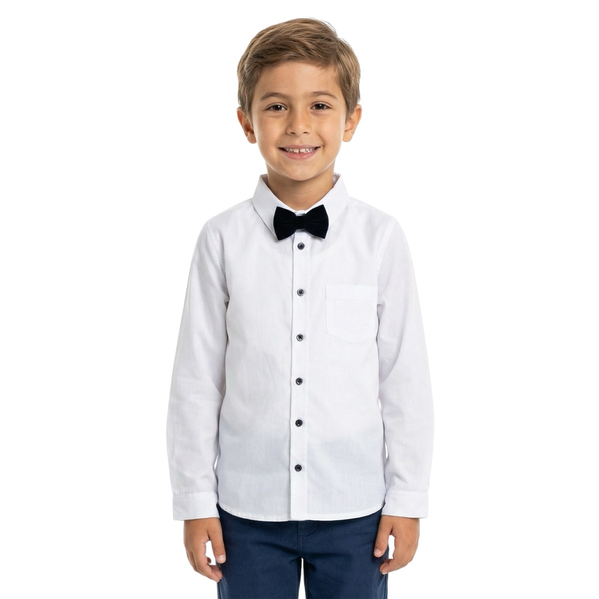 Ένα κομψό μονόχρωμο πουκάμισο για τις επίσημες εμφανίσεις των μικρών κύριων από λεπτό ύφασμα. Άνοιγμα με κουμπιά στο εμπρός μέρος. Παπιγιόν με λάστιχο. Σύνθεση από 80% βαμβάκι και 30% πολυεστέρα.