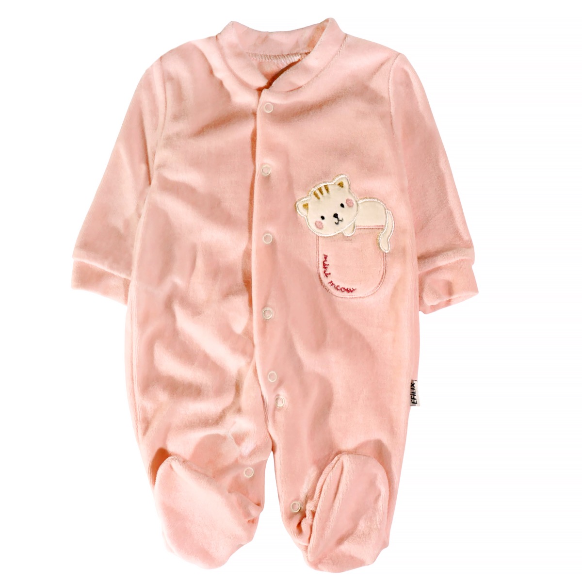 Το ολόσωμο βελουτέ φορμάκι με σκουφάκι Efilix Baby σε ροζ χρώμα αποτελεί την τέλεια λύση για τον χειμώνα. Φτιαγμένο από βελουτέ βαμβακερό ύφασμα με σύνθεση 80% βαμβάκι και 20% πολυεστέρα, εξασφαλίζει ζεστασιά και απαλότητα στο μωρό. Τα απλικέ σχέδια στο εμπρός μέρος προσδίδουν γλυκιά εμφάνιση, ενώ το άνοιγμα με τρουκς από τον λαιμό έως κάτω κάνει το άλλαγμα εύκολο και γρήγορο. Συνοδεύεται από ασορτί σκουφάκι που ολοκληρώνει το σετ και κρατά το κεφαλάκι ζεστό. Ένα χειμωνιάτικο ρούχο σχεδιασμένο για κοριτσάκια, ιδανικό για την καθημερινότητα και υπέροχη επιλογή για δώρο.