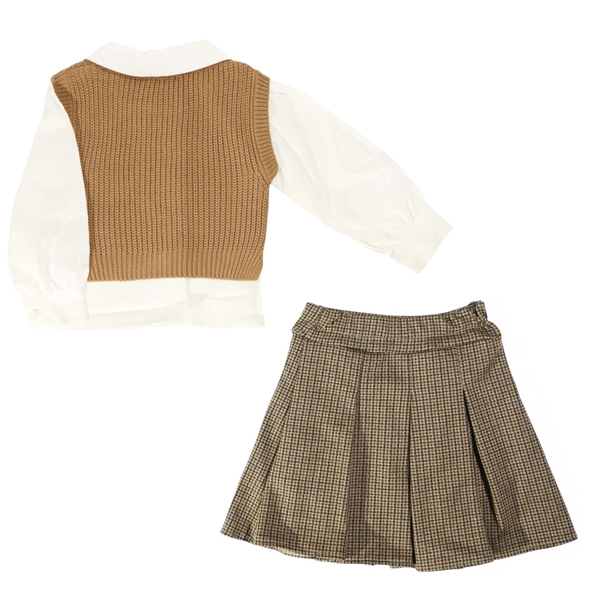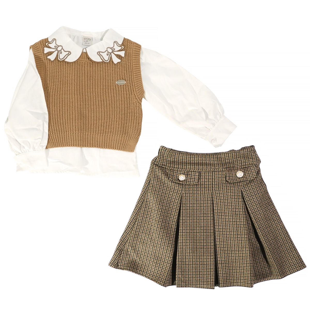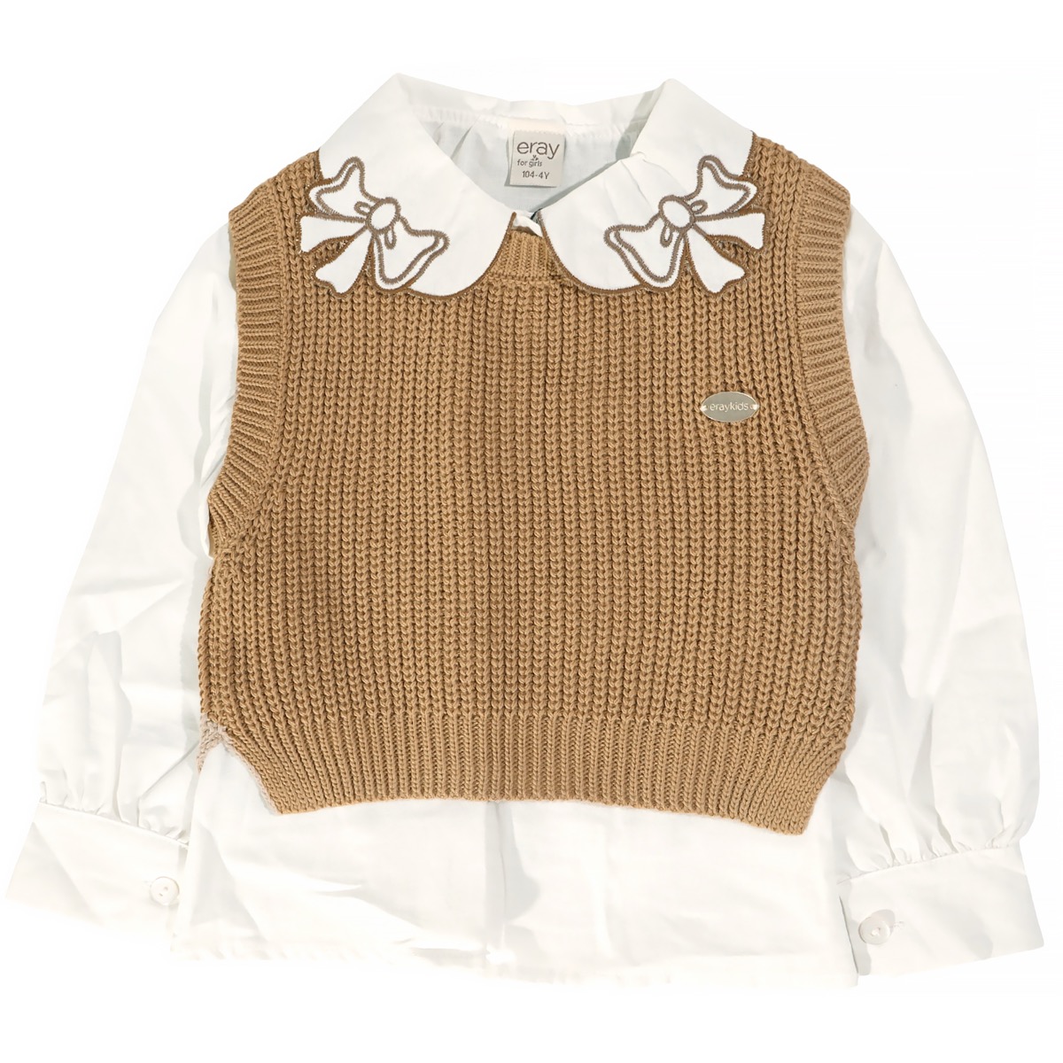 Το σετ της Eray με καφέ γιλέκο και φούστα σε συνδυασμό με λευκό πουκάμισο είναι η τέλεια επιλογή για τη χειμερινή γκαρνταρόμπα της κόρης σας. Περιλαμβάνει ένα κομψό πλεκτό γιλέκο, ένα κλασικό πουκάμισο με κέντημα στο γιακά και μια υπέροχη φούστα με πιέτες. Η φούστα διαθέτει διακοσμητικά κουμπιά και λάστιχο στο πίσω μέρος της μέσης και εσωτερική επένδυση από βαμβακερή φόδρα για επιπλέον άνεση. Όλα τα ρουχαλάκια είναι κατασκευασμένα από 100% βαμβάκι. Το πλεκτό γιλέκο προσθέτει ζεστασιά και στιλ, ενώ το κέντημα στο γιακά του πουκαμίσου δίνει μια εκλεπτυσμένη πινελιά. Ένα ολοκληρωμένο σετ που συνδυάζει κομψότητα και πρακτικότητα για τις ξεχωριστές εμφανίσεις της μικρής σας.