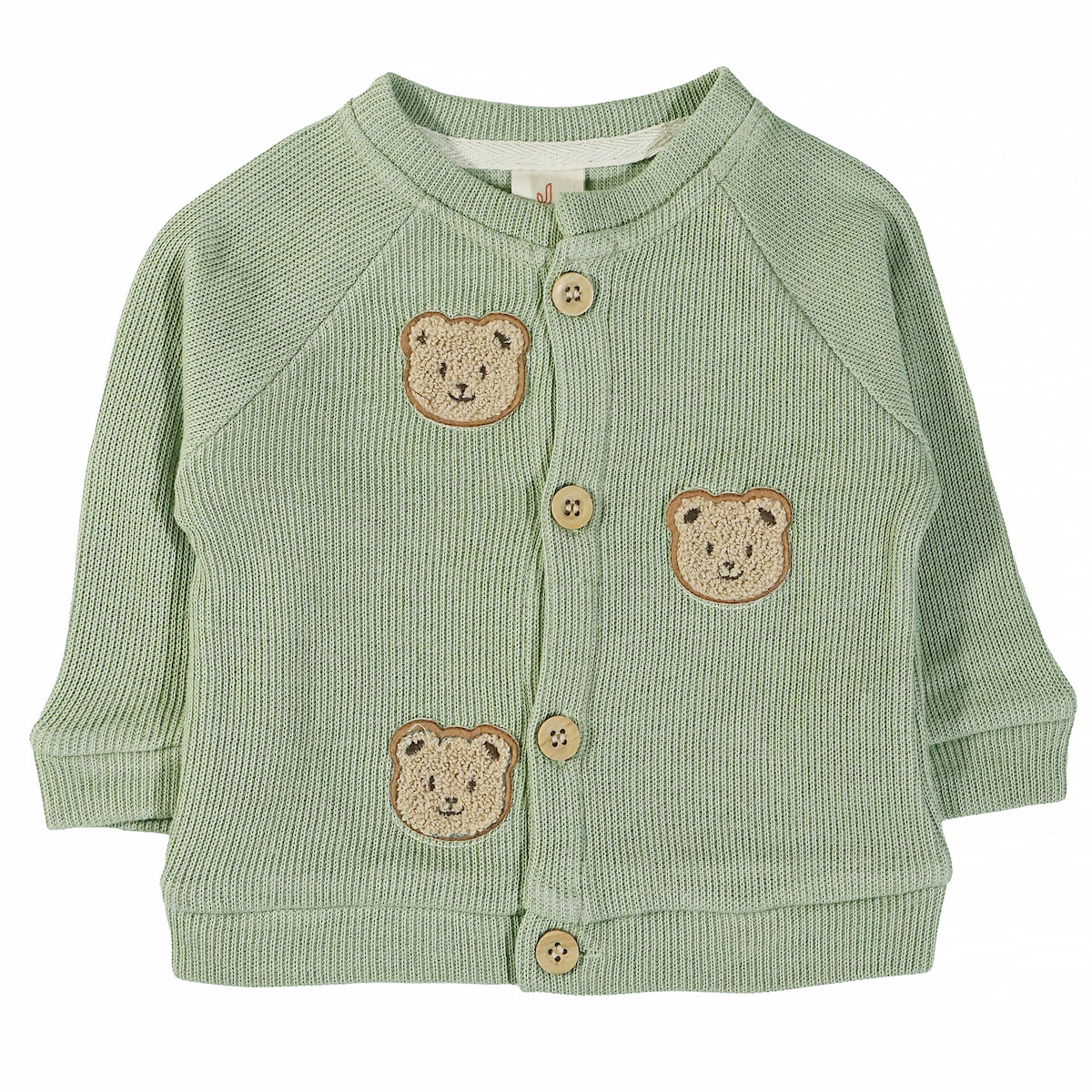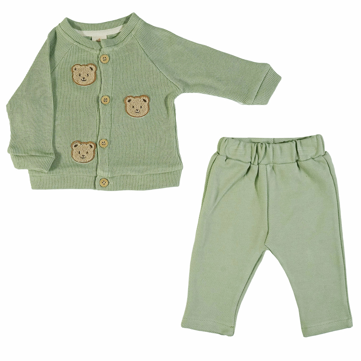 Το πλεκτό βρεφικό σετ από τη Joyol αποτελεί μια υπέροχη πρόταση για να κρατήσετε τα αγοράκια σας ζεστά και κομψά κατά την άνοιξη και το φθινόπωρο. Η πράσινη απόχρωση δίνει έναν φυσικό τόνο στην εμφάνιση, ενώ τα γλυκά απλικέ αρκουδάκια στο μπροστινό μέρος της μπλούζας προσθέτουν μια παιχνιδιάρικη διάθεση που θα λατρέψετε. Το άνοιγμα με κουμπιά μπροστά διευκολύνει σημαντικά το ντύσιμο, γλιτώνοντάς σας χρόνο στην καθημερινή φροντίδα. Το παντελόνι διαθέτει λάστιχο περιμετρικά στη μέση, εξασφαλίζοντας σωστή εφαρμογή χωρίς να πιέζει την κοιλίτσα του μωρού. Η σύνθεση από 100% βαμβάκι εγγυάται ότι το ρούχο σέβεται το ευαίσθητο δέρμα και προσφέρει μια φυσική αίσθηση θαλπωρής σε κάθε βόλτα ή επίσκεψη.