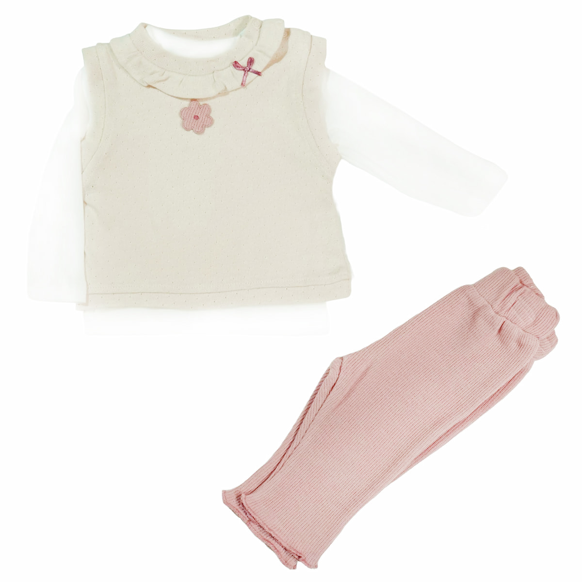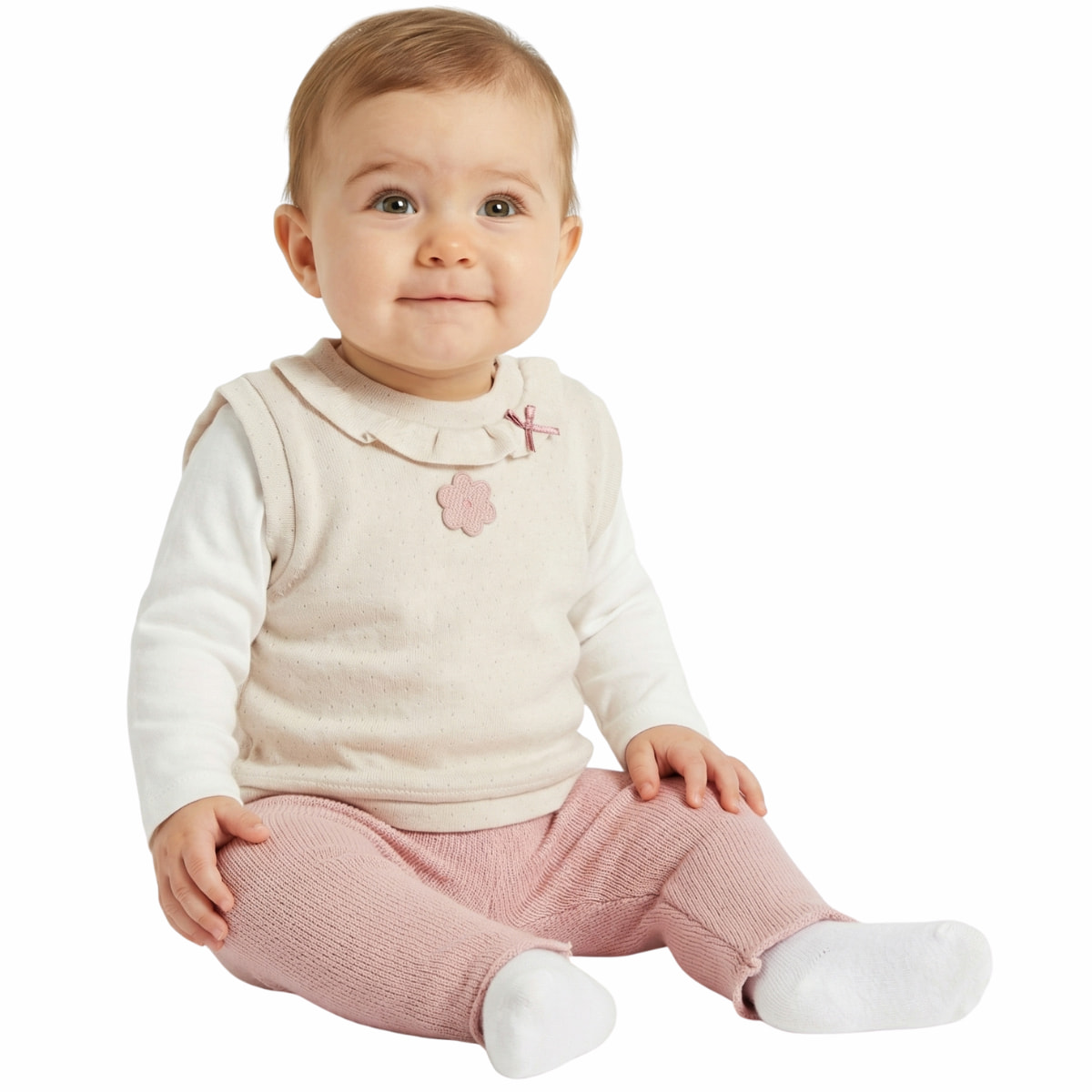 Το πλεκτό σετ τριών τεμαχίων από τη Joyol είναι μια ολοκληρωμένη και γλυκιά πρόταση για τις ενδιάμεσες εποχές της άνοιξης και του φθινοπώρου. Συνδυάζει αρμονικά ένα μπεζ πλεκτό γιλέκο που προσφέρει ζεστασιά, με μια κλασική λευκή μακρυμάνικη μπλούζα και ένα χαριτωμένο ροζ παντελόνι. Τόσο το γιλέκο όσο και η μπλούζα διαθέτουν πρακτικά τρουκς στον ώμο, κάνοντας το ντύσιμο της μικρής σας μια γρήγορη και εύκολη διαδικασία. Το παντελόνι εφαρμόζει άνετα χάρη στο λάστιχο που υπάρχει περιμετρικά στη μέση, ώστε να μην πιέζει την κοιλίτσα. Κατασκευασμένο εξ ολοκλήρου από 100% βαμβάκι, το σετ αγκαλιάζει το ευαίσθητο δέρμα με φυσική απαλότητα, επιτρέποντας στο παιδί να κινείται και να παίζει ελεύθερα, απολαμβάνοντας τη φροντίδα που του αξίζει.