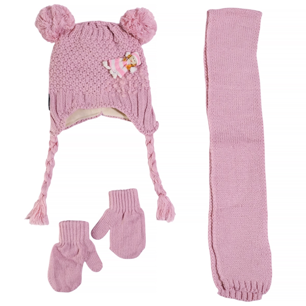 Χαρίστε στις μικρές σας μια γλυκιά πινελιά ζεστασιάς με το πλεκτό σετ της Juju σε ένα απαλό ροζ χρώμα, ιδανικό για τις κρύες ημέρες του χειμώνα. Κατασκευασμένο από 100% ακρυλικό, το μαλακό και χοντρό νήμα αγκαλιάζει απαλά το δερματάκι των κοριτσιών σας, προσφέροντας μέγιστη άνεση. Το σκουφάκι ξεχωρίζει με ένα χαριτωμένο απλικέ σχέδιο στο μπροστινό μέρος και δύο παιχνιδιάρικες φουντίτσες στην κορυφή, ενώ η εσωτερική επένδυση από fleece κρατάει το κεφαλάκι των κοριτσιών σας ζεστό και άνετο. Το κασκόλ και τα γάντια, φτιαγμένα από το ίδιο νήμα, συμπληρώνουν αρμονικά το σετ, προσφέροντας ολοκληρωμένη προστασία και ένα ολοκληρωμένο, χαρούμενο στιλ για τις χειμερινές τους εξορμήσεις.