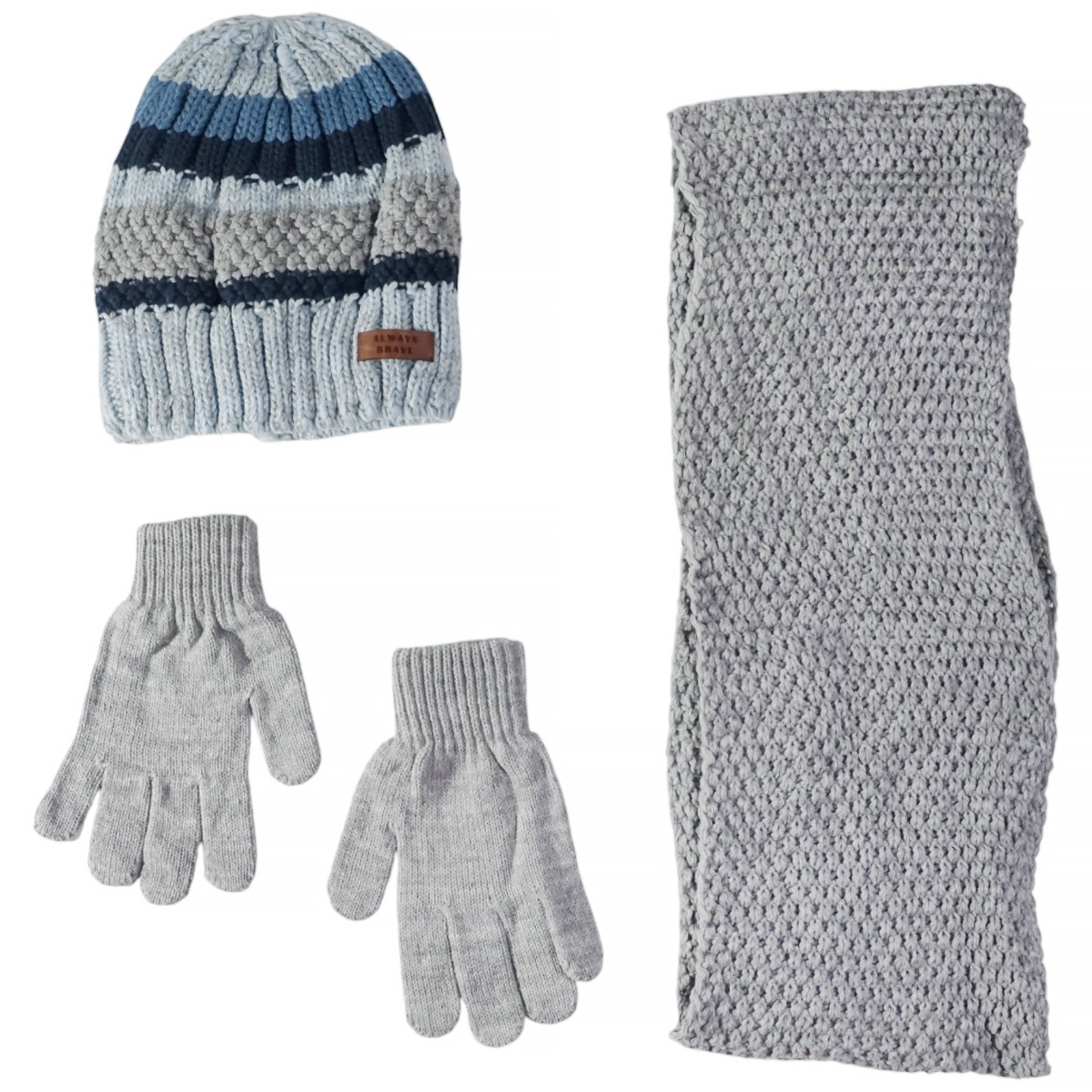 Το πλεκτό σετ από τη Kitti συνδυάζει ζεστασιά με διακριτικό χρώμα, χάρη στο πολύχρωμο σκουφάκι σε τόνους γκρι και γαλάζιου που ταιριάζει όμορφα με το γαλάζιο κασκόλ και τα γαντάκια. Το σκουφάκι καλύπτει καλά το κεφάλι, ενώ το κασκόλ αγκαλιάζει τον λαιμό και τα γαντάκια προστατεύουν τα χέρια όταν ο καιρός γίνεται πιο κρύος. Η σύνθεση από 100% ακρυλικό προσφέρει σταθερή ζεστασιά και μαλακή αίσθηση, κατάλληλη για τις χειμωνιάτικες μέρες. Ένα σετ που διευκολύνει το ντύσιμο των αγοριών σας, καθώς συνδυάζεται εύκολα με μπουφάν και καθημερινά ρούχα για σχολείο, βόλτες και δραστηριότητες.