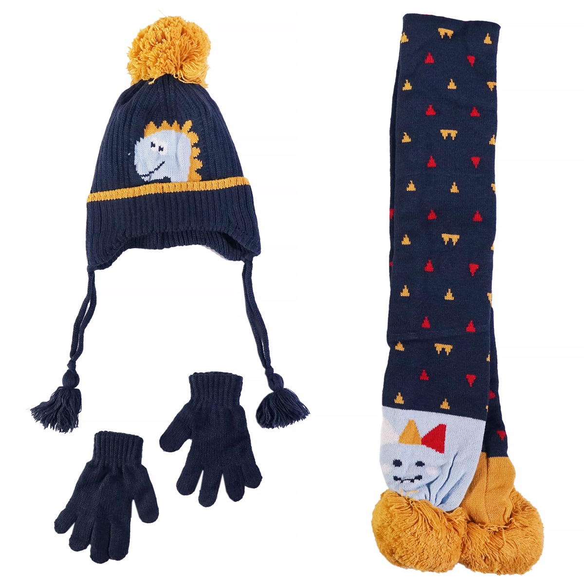 Το πλεκτό σετ της Kitti σε μπλε χρώμα τραβάει τα βλέμματα με τον δεινόσαυρο που διακοσμεί το σκουφάκι και το κασκόλ, ενσωματωμένο μέσα στην πλέξη. Η μεγάλη φούντα στο σκουφάκι και οι φούντες στις άκρες του κασκόλ προσθέτουν παιχνιδιάρικη διάθεση, ενώ τα ασορτί γαντάκια συμπληρώνουν το σύνολο με πρακτικότητα και στιλ. Η σύνθεση από 100% ακρυλικό προσφέρει απαλή υφή και αντοχή, ιδανική για κάθε χειμερινή βόλτα ή δραστηριότητα. Ένα σετ που συνδυάζει φαντασία και άνεση, κρατώντας το παιδί ζεστό και χαρούμενο κάθε μέρα.