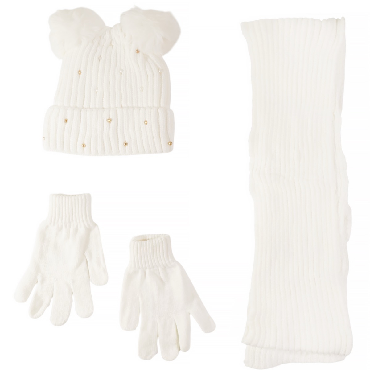 Για τις μικρές σας που αγαπούν τη λάμψη και τη ζεστασιά, το πλεκτό σετ της Kitti σε ένα κομψό εκρού χρώμα είναι η τέλεια επιλογή για τις κρύες ημέρες του χειμώνα. Φτιαγμένο από 100% ακρυλικό, το μαλακό και χοντρό νήμα προσφέρει μια αίσθηση θαλπωρής, ενώ το σκουφάκι με τις διακριτικές πέρλες και τις δύο παιχνιδιάρικες φουντίτσες θα κλέψει τις εντυπώσεις. Η εσωτερική επένδυση από fleece εξασφαλίζει ότι το κεφαλάκι των κοριτσιών σας θα παραμείνει ζεστό και προστατευμένο από το κρύο. Το κασκόλ και τα γάντια, από το ίδιο νήμα, συμπληρώνουν αυτό το υπέροχο σύνολο, προσφέροντας στις μικρές σας άνεση και ένα μοναδικό στιλ για τις χειμερινές τους περιπέτειες.