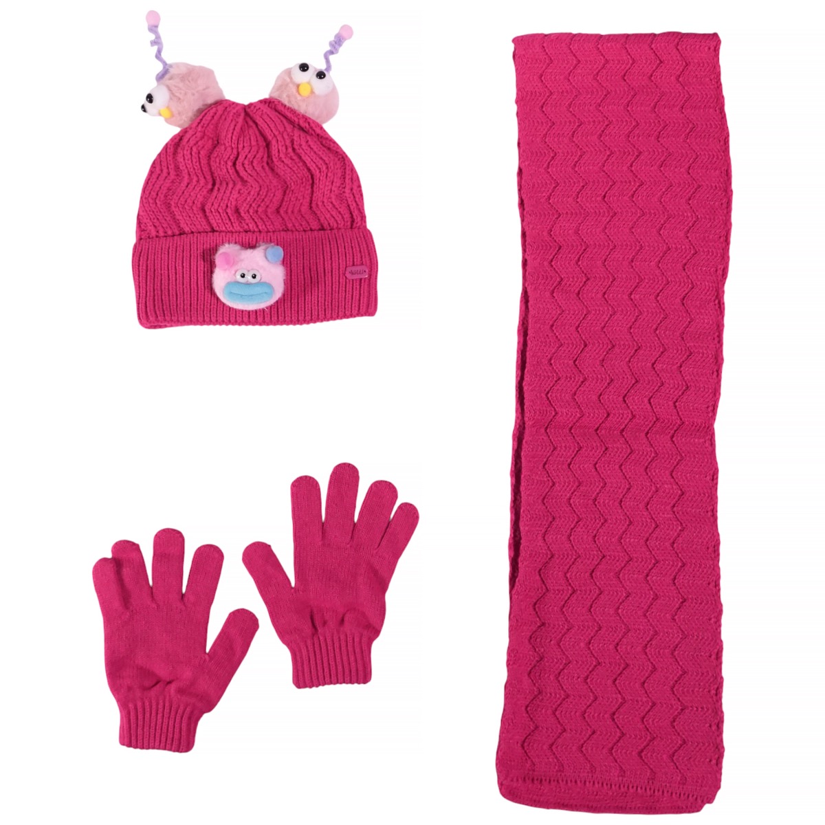 Kitti πλεκτό σετ σκούφος-κασκόλ-γάντια «Fuchsia Funny Face»