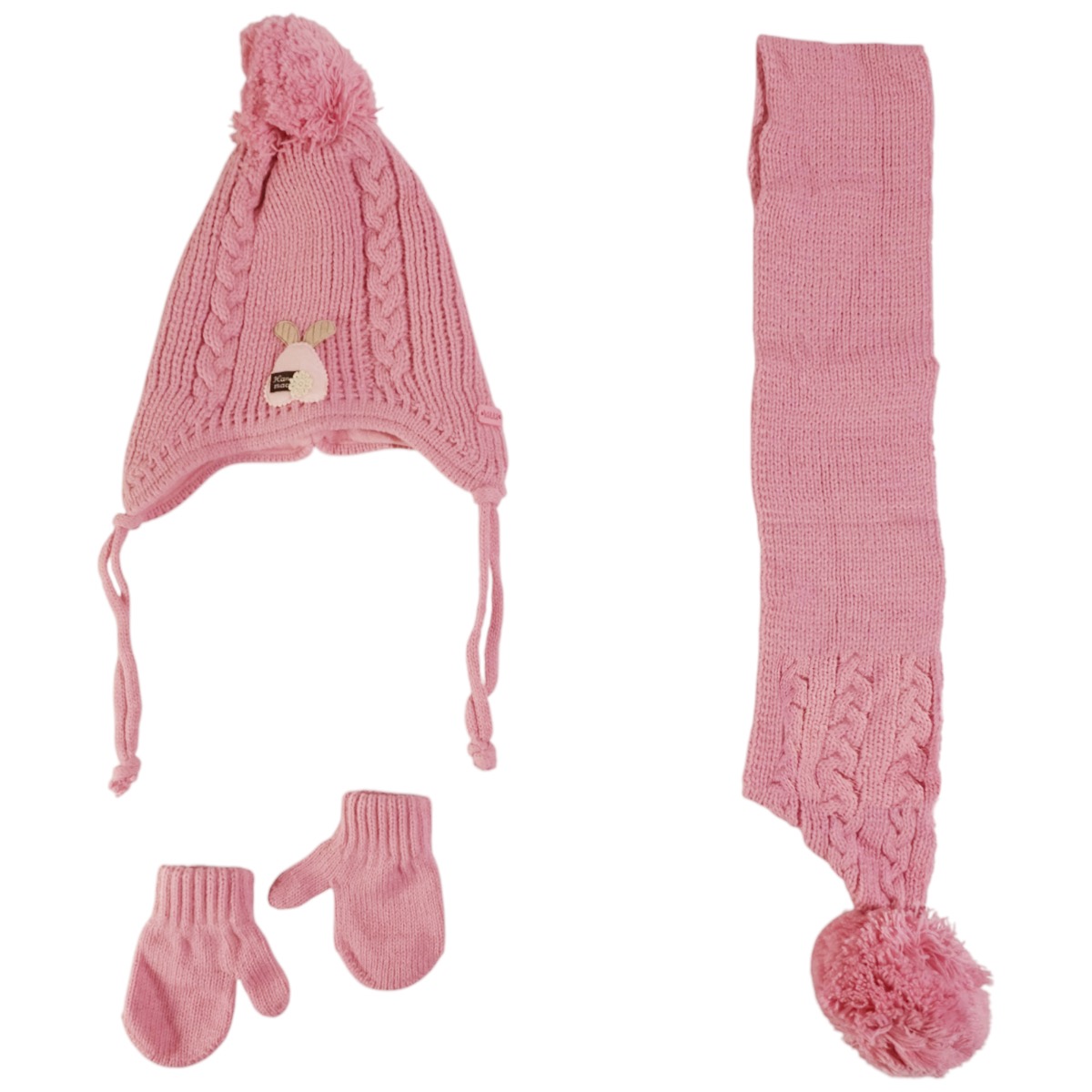 Το πλεκτό σετ σκούφος-κασκόλ-γάντια της Kitti σε φούξια χρώμα είναι η ιδανική επιλογή για κάθε κοριτσάκι που θέλει να ξεχωρίζει με στιλ τις κρύες μέρες του χειμώνα. Ο σκούφος διαθέτει απλικέ σχέδιο με μεγάλη φούντα στο επάνω μέρος και πλαϊνά κορδόνια για καλύτερη εφαρμογή και επιπλέον ζεστασιά. Το κασκόλ και τα γάντια σε ασορτί φούξια απόχρωση ολοκληρώνουν το σύνολο, προσφέροντας μια χαρούμενη και κομψή εμφάνιση. Η σύνθεση από 100% ακρυλικό προσφέρει απαλότητα, ανθεκτικότητα και εύκολη φροντίδα, καθιστώντας το σετ πρακτικό και άνετο για κάθε καθημερινή δραστηριότητα του παιδιού.