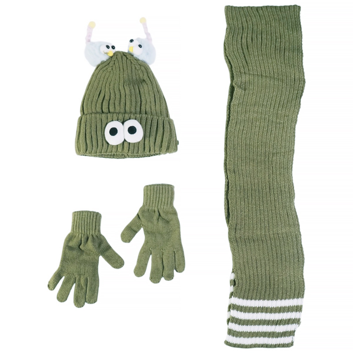 Το πλεκτό σετ Kitty για αγόρια σε πράσινο χρώμα περιλαμβάνει σκούφο, κασκόλ και γάντια, προσφέροντας πλήρη προστασία από το κρύο του χειμώνα. Κατασκευασμένο από 100% ακρυλικό μαλακό, χοντρό νήμα, εξασφαλίζει μέγιστη ζεστασιά και απαλότητα σε κάθε χειμερινή έξοδο. Ο σκούφος διαθέτει χαριτωμένο απλικέ σχέδιο με ματάκια στο μπροστινό μέρος και λούτρινες λεπτομέρειες στο επάνω, δίνοντας έναν παιχνιδιάρικο και ζωντανό χαρακτήρα, ενώ η εσωτερική επένδυση από fleece εξασφαλίζει επιπλέον ζεστασιά και προστασία. Το κασκόλ και τα γάντια φτιαγμένα από το ίδιο νήμα συμπληρώνουν αρμονικά το σύνολο, δημιουργώντας μια ολοκληρωμένη και στιλάτη εμφάνιση. Ιδανικό για τις πιο παγωμένες μέρες, το σετ αυτό συνδυάζει λειτουργικότητα με μοντέρνο σχεδιασμό, γίνοντας απαραίτητο κομμάτι της χειμερινής γκαρνταρόμπας κάθε μικρού αγοριού.