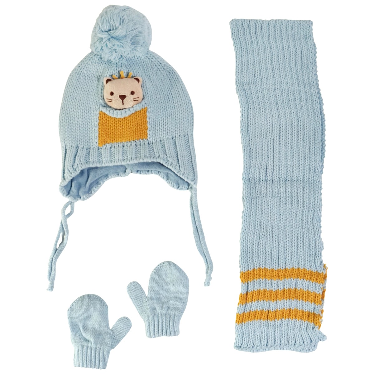 Το πλεκτό σετ σκούφος-κασκόλ-γάντια της Kitti σε γαλάζιο χρώμα είναι μια φωτεινή πρόταση για τα αγόρια που θέλουν να ξεχωρίζουν τις κρύες μέρες του χειμώνα. Το σκουφάκι με το απλικέ σχέδιο και τη μεγάλη φούντα στο επάνω μέρος δίνει παιχνιδιάρικη διάθεση, ενώ το ασορτί κασκόλ και τα γάντια προσφέρουν ολοκληρωμένη προστασία από το κρύο. Η σύνθεση από 100% ακρυλικό εξασφαλίζει απαλή υφή και άνεση, ιδανική για καθημερινή χρήση στο σχολείο ή τη βόλτα. Ένα σετ που συνδυάζει πρακτικότητα και χαρούμενο στιλ, κρατώντας το παιδί σας ζεστό και άνετο όλη τη διάρκεια του χειμώνα.
