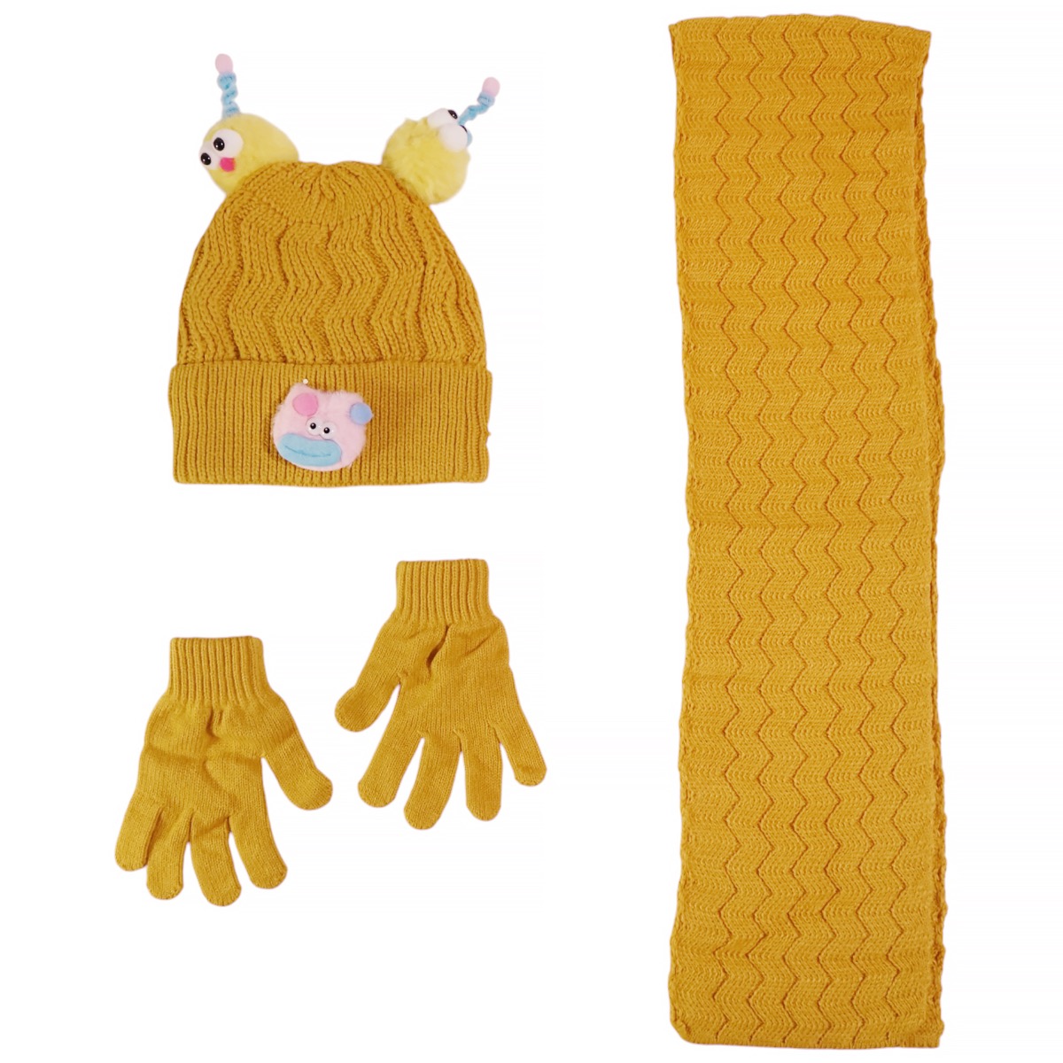 Για τις μικρές εξερευνήτριες που αγαπούν το στιλ και τη ζεστασιά, το πλεκτό σετ σκούφος-κασκόλ-γάντια της Kitti σε μουσταρδί χρώμα είναι μια ξεχωριστή πρόταση για τον χειμώνα. Το σκουφάκι διακοσμείται με απλικέ σχέδιο και δύο παιχνιδιάρικες φουντίτσες με ζωάκια στο επάνω μέρος, προσθέτοντας μια χαρούμενη και πρωτότυπη πινελιά. Το ασορτί κασκόλ και τα γάντια ολοκληρώνουν το σετ, προσφέροντας άνεση και προστασία από το κρύο σε κάθε βόλτα ή παιχνίδι. Η σύνθεση από 100% ακρυλικό εξασφαλίζει απαλή υφή και εύκολη φροντίδα, ιδανική για καθημερινή χρήση.
