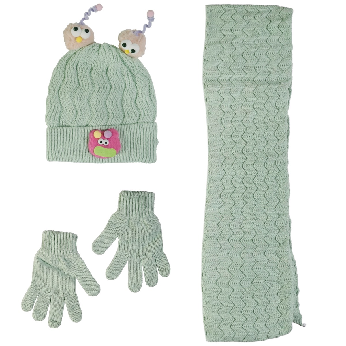 Το πλεκτό σετ σκούφος-κασκόλ-γάντια της Kitti σε ένα δροσερό βεραμάν χρώμα είναι η ιδανική επιλογή για να κρατήσετε τα κοριτσάκια σας ζεστά και χαρούμενα τον χειμώνα. Κατασκευασμένο από 100% ακρυλικό νήμα, προσφέρει απαλή αίσθηση και αποτελεσματική προστασία από το κρύο. Το σκουφάκι ξεχωρίζει με ένα χαριτωμένο απλικέ σχέδιο και δύο παιχνιδιάρικες φουντίτσες με ζωάκια στο επάνω μέρος. Τα ασορτί γάντια και το κασκόλ συμπληρώνουν ιδανικά το σύνολο, προσφέροντας ζεστασιά και ένα μοναδικό στιλ σε κάθε χειμερινή τους εμφάνιση.