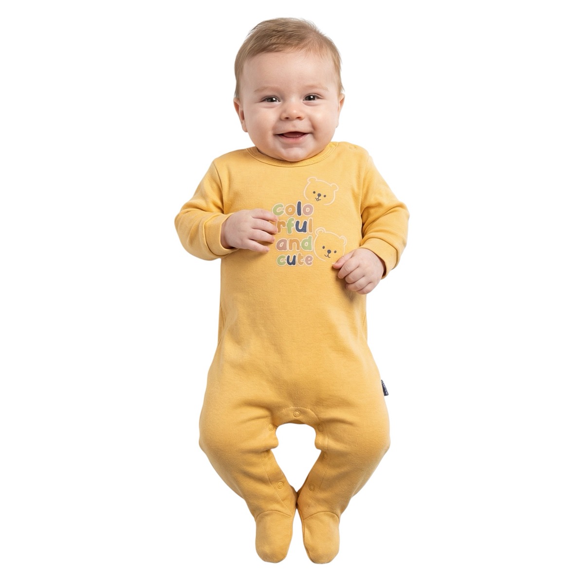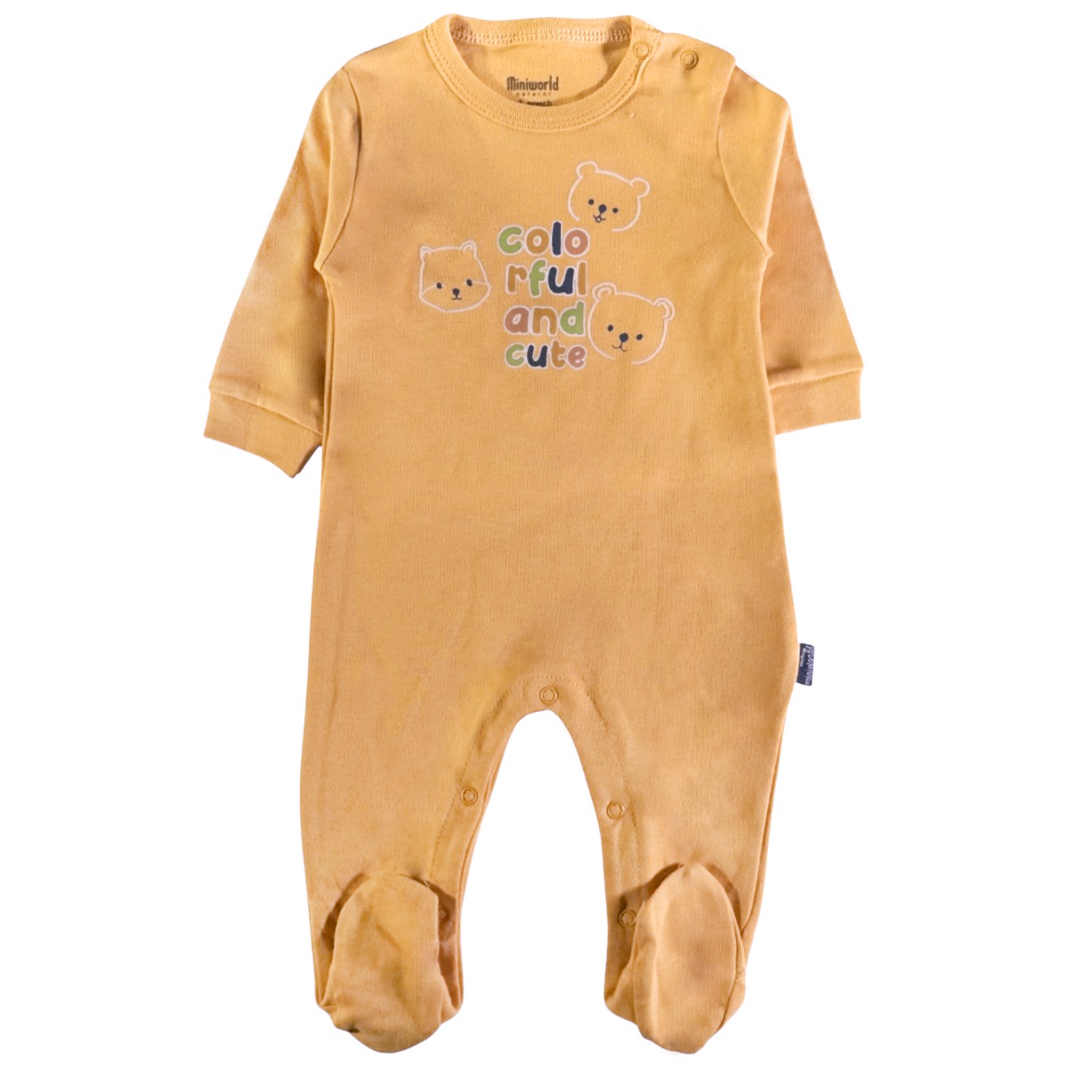 Το ολόσωμο φορμάκι της Miniworld σε ένα ζεστό μουσταρδί χρώμα είναι η τέλεια επιλογή για το βρεφάκι σας κατά την άνοιξη και το φθινόπωρο. Κατασκευασμένο από 100% βαμβακερό, λεπτό ύφασμα, προσφέρει απαλή αίσθηση και άνεση στο ευαίσθητο δερματάκι του μωρού σας. Το χαριτωμένο τύπωμα στο μπροστινό μέρος προσθέτει μια παιχνιδιάρικη νότα, ενώ το άνοιγμα με τρουκς στον ώμο και στο κάτω μέρος εξασφαλίζει εύκολη και γρήγορη αλλαγή πάνας.
