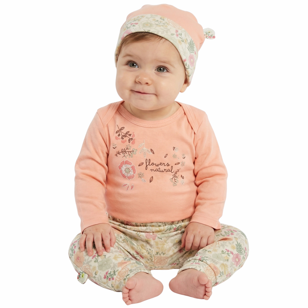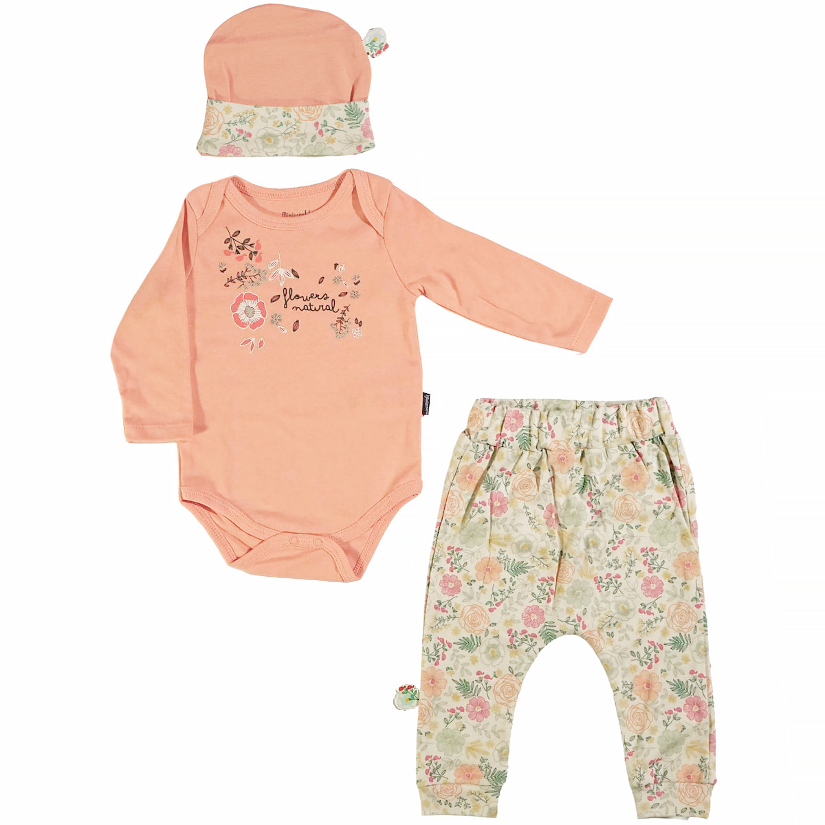 Το σετ από τη Miniworld είναι μια όμορφη και πρακτική επιλογή για να υποδεχτείτε την άνοιξη και το φθινόπωρο μαζί με τις μικρές σας. Περιλαμβάνει ένα σομόν κορμάκι φτιαγμένο από 100% βαμβάκι, το οποίο εξασφαλίζει την απαραίτητη απαλότητα που χρειάζεται το ευαίσθητο δέρμα τους. Η χαριτωμένη στάμπα με λουλουδάκια στο μπροστινό μέρος προσθέτει μια γλυκιά πινελιά, ενώ τα τρουκς στο κάτω μέρος διευκολύνουν σημαντικά την αλλαγή της πάνας. Το παντελόνι σε μπεζ απόχρωση διαθέτει σχέδια σε όλη του την επιφάνεια και έχει λάστιχο στη μέση και στο τελείωμα για να προσφέρει σταθερότητα και απόλυτη ελευθερία κινήσεων. Το σύνολο ολοκληρώνεται με το σομόν σκουφάκι που προστατεύει το κεφαλάκι του μωρού σας στις καθημερινές βόλτες. Πρόκειται για έναν συνδυασμό που προσφέρει στιλ και άνεση, κάνοντας τις πρώτες εμφανίσεις των κοριτσιών σας πραγματικά ξεχωριστές.
