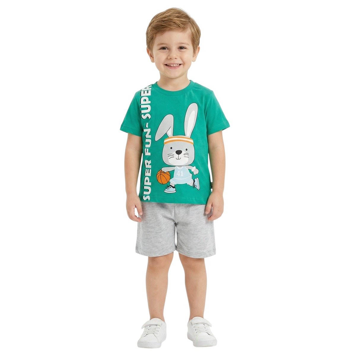 Το καλοκαιρινό σετ Moyes είναι η τέλεια επιλογή για δραστήρια αγόρια που χρειάζονται άνεση και στυλ στις καθημερινές τους εμφανίσεις! Η κοντομάνικη μπλούζα σε φωτεινή πράσινη απόχρωση, με μοντέρνα στάμπα στο μπροστινό μέρος, προσθέτει παιχνιδιάρικη διάθεση. Το γκρι σορτσάκι με λάστιχο στη μέση εξασφαλίζει σταθερή εφαρμογή και ελευθερία κινήσεων. Κατασκευασμένο από 100% βαμβάκι, το σετ είναι απαλό και δροσερό, ιδανικό για τις ζεστές ημέρες του καλοκαιριού. Ένα ευκολοφόρετο σύνολο που συνδυάζει άνεση και ποιότητα, ιδανικό για παιχνίδι, βόλτες και καθημερινές δραστηριότητες.