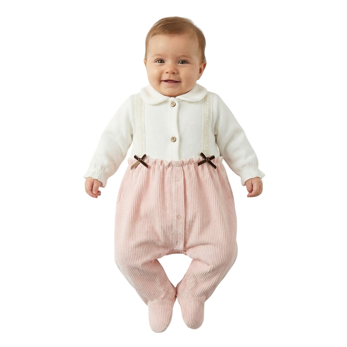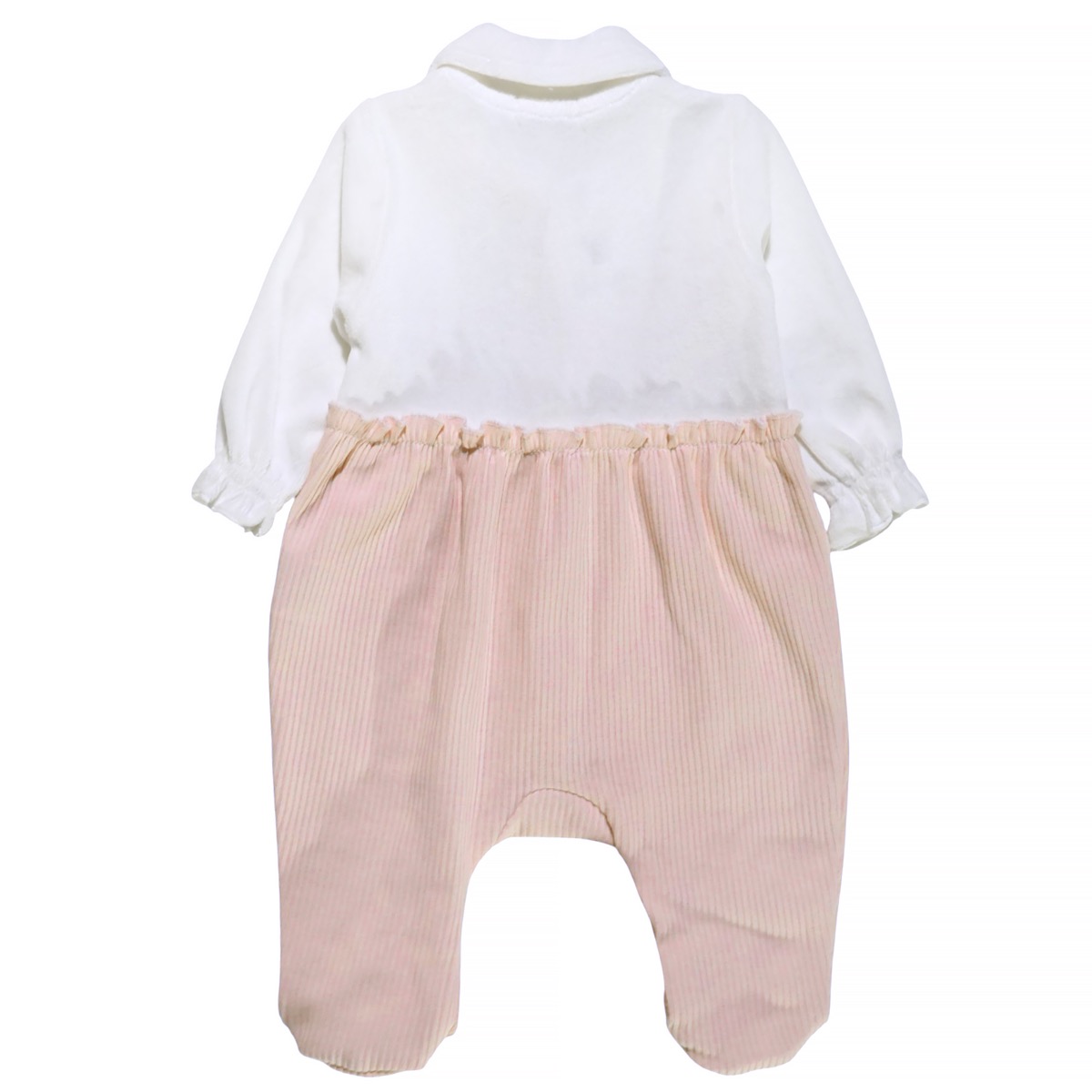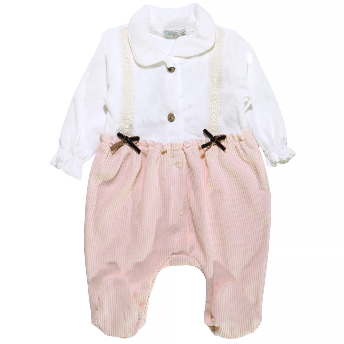 Το ολόσωμο βελουτέ φορμάκι με σκουφάκι Nanon Baby σε σομόν και λευκό χρώμα είναι η τέλεια επιλογή για τον χειμώνα. Κατασκευασμένο από 100% βαμβάκι, συνδυάζει βελουτέ βαμβακερό ύφασμα στο επάνω μέρος και ριμπ μακό στο κάτω, προσφέροντας ζεστασιά και άνεση στο μωρό. Τα μικρά φιογκάκια στο εμπρός μέρος χαρίζουν γλυκιά και χαριτωμένη εμφάνιση, ενώ το άνοιγμα με τρουκς στο εμπρός μέρος διευκολύνει το άλλαγμα. Ένα χειμωνιάτικο ρούχο για κοριτσάκια που συνδυάζει πρακτικότητα με απαλότητα.