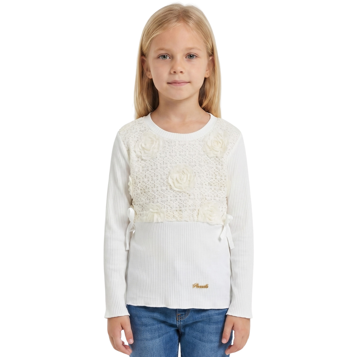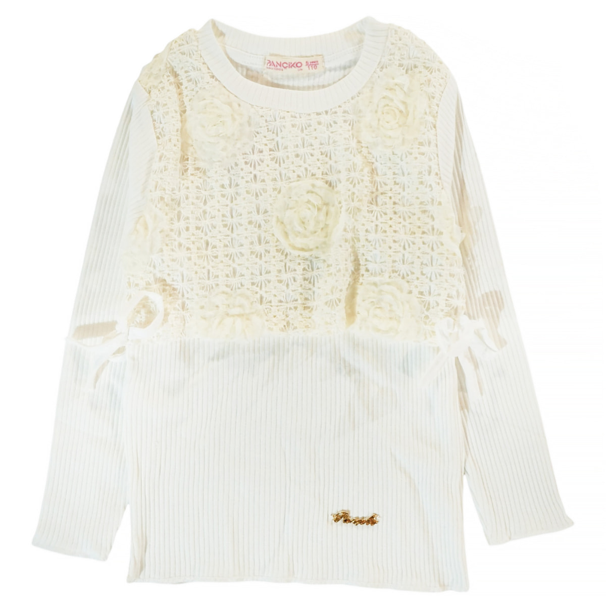 Η μακρυμάνικη μπλούζα από την Pancico Life είναι μια εξαιρετικά ρομαντική και προσεγμένη επιλογή που θα αναδείξει τις ανοιξιάτικες και φθινοπωρινές εμφανίσεις των κοριτσιών σας. Η κομψή εκρού απόχρωση δημιουργεί τον τέλειο καμβά για να αναδειχθούν οι υπέροχες λεπτομέρειες του ρούχου, όπως η φίνα δαντέλα και τα ντελικάτα τούλινα λουλούδια που στολίζουν το μπροστινό μέρος, χαρίζοντας μια αίσθηση αθωότητας και χάρης. Κατασκευασμένη από εξαιρετικής ποιότητας ριμπ ύφασμα, με σύνθεση αποκλειστικά από 100% βαμβάκι, η μπλούζα αγκαλιάζει απαλά το παιδικό σώμα, προσφέροντας φυσική αίσθηση και επιτρέποντας στο δέρμα να αναπνέει ελεύθερα. Η ελαστικότητα της ριμπ πλέξης εξασφαλίζει σταθερή και άνετη εφαρμογή καθ’ όλη τη διάρκεια της ημέρας, κάνοντάς την ιδανική επιλογή τόσο για ξεχωριστές, επίσημες περιστάσεις όσο και για περιποιημένες καθημερινές βόλτες, συνδυάζοντας άψογα την υψηλή αισθητική με την πρακτικότητα.