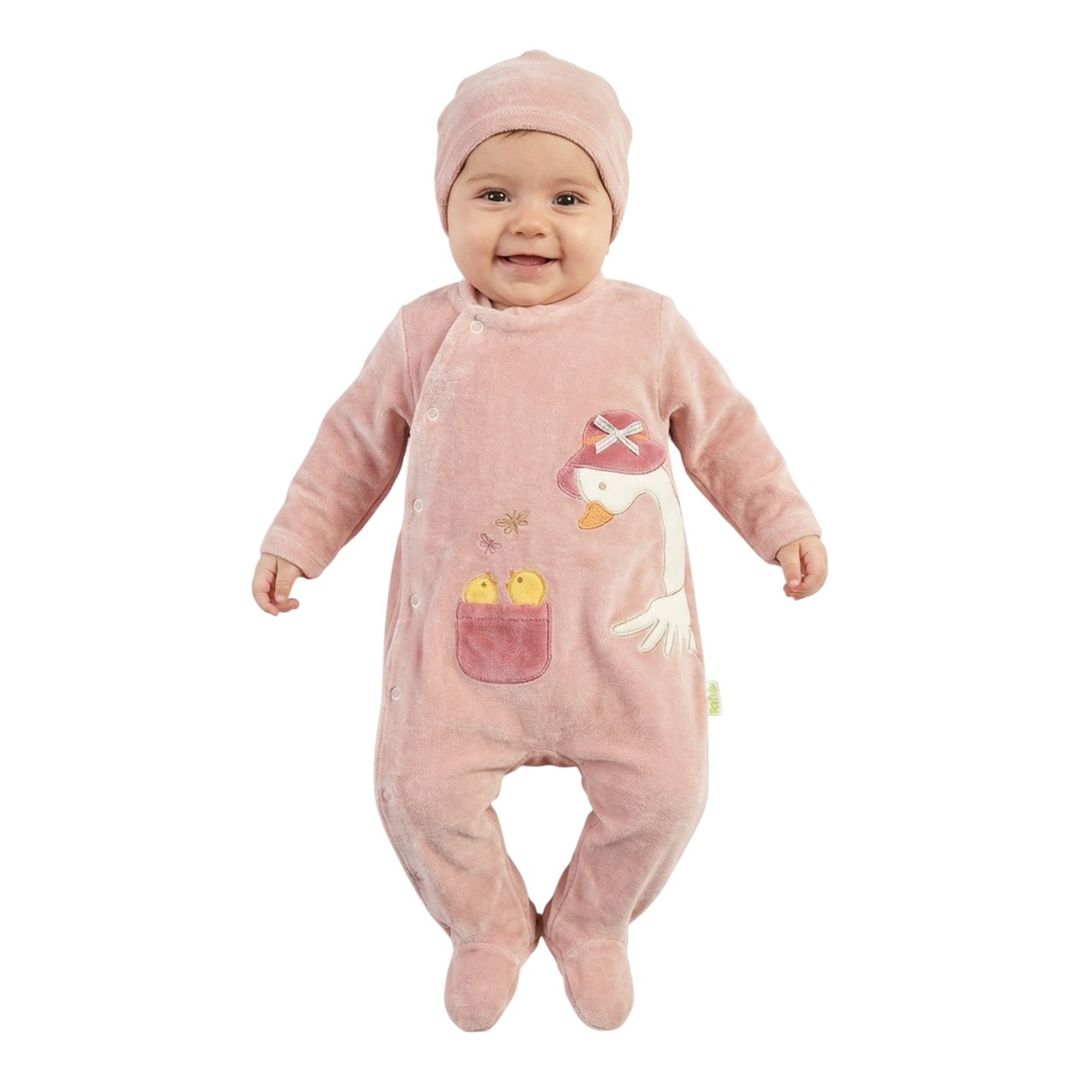 Το ολόσωμο βελουτέ φορμάκι με σκουφάκι Pera Bebe σε σομόν χρώμα είναι ιδανικό για τις κρύες μέρες του χειμώνα. Φτιαγμένο από βελουτέ βαμβακερό ύφασμα με σύνθεση 80% βαμβάκι και 20% πολυεστέρα, εξασφαλίζει ζεστασιά και άνεση στο μωρό. Τα απλικέ σχέδια στο εμπρός μέρος προσδίδουν χαριτωμένη εμφάνιση, ενώ το πρακτικό άνοιγμα με τρουκς στο πλάι, από τον λαιμό έως κάτω, κάνει το άλλαγμα εύκολο και γρήγορο. Συνοδεύεται από ασορτί σκουφάκι που ολοκληρώνει το σετ και κρατά το κεφαλάκι ζεστό. Ένα χειμωνιάτικο ρούχο σχεδιασμένο για κοριτσάκια, κατάλληλο για καθημερινή χρήση και υπέροχη επιλογή για δώρο.
