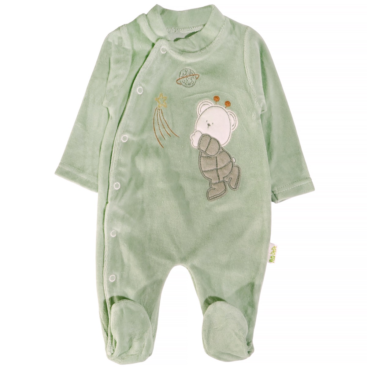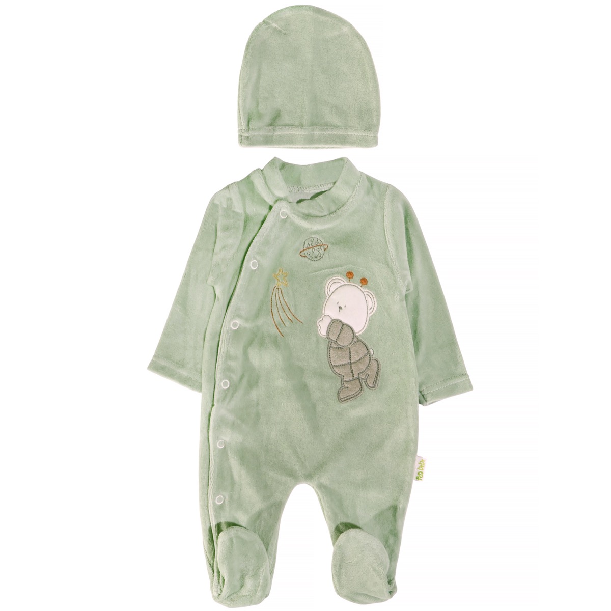 Το ολόσωμο βελουτέ φορμάκι της Pera Bebe σε βεραμάν απόχρωση είναι ιδανικό για τον χειμώνα και προσφέρει ζεστασιά και άνεση στο αγοράκι σας. Κατασκευασμένο από βελουτέ βαμβακερό ύφασμα με σύνθεση 80% βαμβάκι και 20% πολυεστέρα, διαθέτει απλικέ σχέδια στο εμπρός μέρος που προσδίδουν παιχνιδιάρικο χαρακτήρα. Το άνοιγμα με τρουκς από πάνω έως κάτω διευκολύνει την αλλαγή της πάνας, ενώ το ασορτί σκουφάκι που το συνοδεύει ολοκληρώνει το στιλ και κρατάει το κεφαλάκι ζεστό. Ένα πρακτικό και όμορφο ρούχο για τις κρύες μέρες.