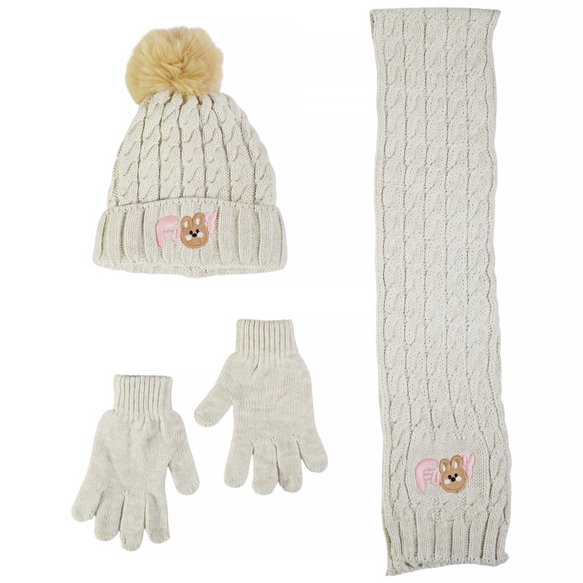 Το πλεκτό σετ της Recos, σε ένα διαχρονικό μπεζ χρώμα, είναι η τέλεια επιλογή για να προσφέρετε στις μικρές σας ζεστασιά και κομψότητα τις κρύες ημέρες του χειμώνα. Κατασκευασμένο από 100% ακρυλικό, το μαλακό και χοντρό νήμα αγκαλιάζει απαλά το δερματάκι των κοριτσιών σας, προσφέροντας μέγιστη άνεση. Το σκουφάκι ξεχωρίζει με ένα χαριτωμένο απλικέ σχέδιο στο μπροστινό μέρος και μια εντυπωσιακή φούντα στην κορυφή, ενώ η εσωτερική επένδυση από fleece κρατάει το κεφαλάκι των κοριτσιών σας ζεστό και άνετο. Το κασκόλ και τα γάντια, φτιαγμένα από το ίδιο νήμα, συμπληρώνουν αρμονικά το σετ, προσφέροντας ολοκληρωμένη προστασία και ένα ολοκληρωμένο, στιλάτο σύνολο για τις χειμερινές τους εξορμήσεις.