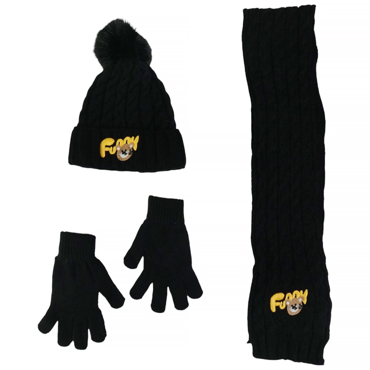 Το πλεκτό σετ της Recos, σε διαχρονικό μαύρο χρώμα, είναι η ιδανική επιλογή για να κρατήσετε τους μικρούς σας ήρωες ζεστούς και άνετους τις κρύες ημέρες του χειμώνα. Φτιαγμένο από 100% ακρυλικό, το μαλακό και χοντρό νήμα προσφέρει απαλή αίσθηση και αποτελεσματική προστασία από το κρύο. Το σκουφάκι διαθέτει ένα στιλάτο απλικέ σχέδιο στο μπροστινό μέρος και μια εντυπωσιακή φούντα στην κορυφή, ενώ η εσωτερική επένδυση από fleece εξασφαλίζει επιπλέον ζεστασιά και άνεση. Το κασκόλ και τα γάντια, από το ίδιο νήμα, συμπληρώνουν το σετ, προσφέροντας στα αγοράκια σας ένα ολοκληρωμένο και πρακτικό σύνολο που συνδυάζεται εύκολα με όλα τους τα ρούχα, κρατώντας τα ζεστά και έτοιμα για κάθε τους περιπέτεια.