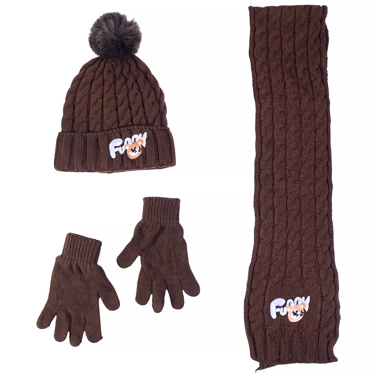 Το πλεκτό σετ της Recos, σε ζεστό καφέ χρώμα, είναι η τέλεια επιλογή για να κρατήσετε τους μικρούς σας εξερευνητές ζεστούς και άνετους τις κρύες ημέρες του χειμώνα. Κατασκευασμένο από 100% ακρυλικό, το μαλακό και χοντρό νήμα προσφέρει απαλή αίσθηση και αποτελεσματική προστασία από το κρύο. Το σκουφάκι ξεχωρίζει με ένα στιλάτο απλικέ σχέδιο στο μπροστινό μέρος και μια εντυπωσιακή φούντα στην κορυφή, ενώ η εσωτερική επένδυση από fleece εξασφαλίζει επιπλέον ζεστασιά και άνεση. Το κασκόλ και τα γάντια, από το ίδιο νήμα, συμπληρώνουν το σετ, προσφέροντας στα αγοράκια σας ένα ολοκληρωμένο και πρακτικό σύνολο που συνδυάζεται εύκολα με όλα τους τα ρούχα, κρατώντας τα ζεστά και έτοιμα για κάθε τους περιπέτεια.