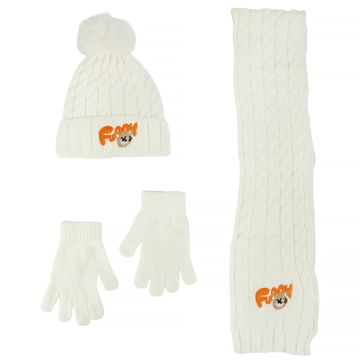 Το πλεκτό σετ σκούφος-κασκόλ-γάντια Recos είναι ιδανικό για τις πιο κρύες ημέρες του χειμώνα. Αποτελείται από τρία τεμάχια φτιαγμένα από μαλακό, χοντρό 100% ακρυλικό νήμα σε εκρού χρώμα, προσφέροντας ζεστασιά και άνεση. Ο σκούφος διαθέτει απλικέ σχέδιο στο εμπρός μέρος και μεγάλη φούντα στην κορυφή, ενώ η εσωτερική επένδυση από fleece εξασφαλίζει επιπλέον ζεστασιά. Το κασκόλ και τα γάντια είναι κατασκευασμένα από το ίδιο νήμα, δημιουργώντας ένα όμορφο και ταιριαστό σύνολο. Απευθύνεται σε κορίτσια και είναι κατάλληλο για τη χειμερινή περίοδο.