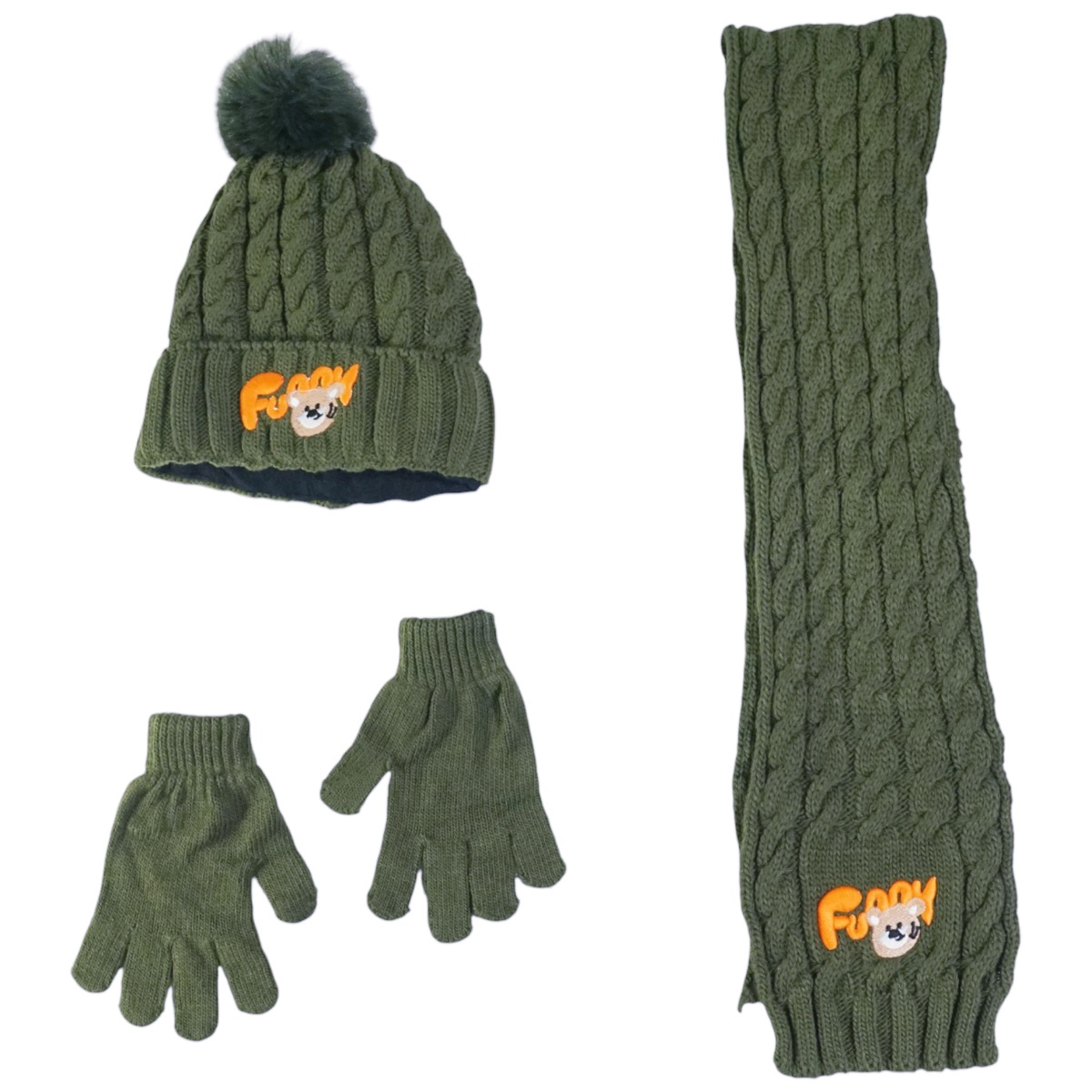 Το πλεκτό σετ της Recos, σε ένα ζωηρό πράσινο χρώμα, είναι η ιδανική επιλογή για να κρατήσετε τους μικρούς σας εξερευνητές ζεστούς και γεμάτους ενέργεια τις κρύες ημέρες του χειμώνα. Φτιαγμένο από 100% ακρυλικό, το μαλακό και χοντρό νήμα προσφέρει απαλή αίσθηση και αποτελεσματική προστασία από το κρύο. Το σκουφάκι διαθέτει ένα στιλάτο απλικέ σχέδιο στο μπροστινό μέρος και μια εντυπωσιακή φούντα στην κορυφή, ενώ η εσωτερική επένδυση από fleece εξασφαλίζει επιπλέον ζεστασιά και άνεση. Το κασκόλ και τα γάντια, από το ίδιο νήμα, συμπληρώνουν το σετ, προσφέροντας στα αγοράκια σας ένα ολοκληρωμένο και πρακτικό σύνολο που συνδυάζεται εύκολα με όλα τους τα ρούχα, κρατώντας τα ζεστά και έτοιμα για κάθε τους περιπέτεια.