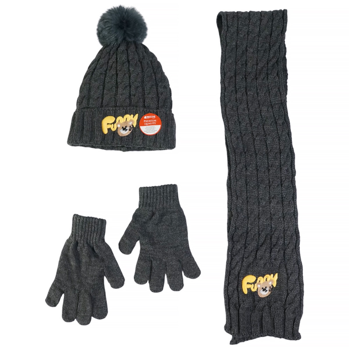 Το πλεκτό σετ της Recos, σε ένα μοντέρνο γκρι χρώμα, είναι η τέλεια επιλογή για να κρατήσετε τους μικρούς σας ζεστούς και στιλάτους τις κρύες ημέρες του χειμώνα. Κατασκευασμένο από 100% ακρυλικό, το μαλακό και χοντρό νήμα προσφέρει απαλή αίσθηση και αποτελεσματική προστασία από το κρύο. Το σκουφάκι ξεχωρίζει με ένα στιλάτο απλικέ σχέδιο στο μπροστινό μέρος και μια εντυπωσιακή φούντα στην κορυφή, ενώ η εσωτερική επένδυση από fleece εξασφαλίζει επιπλέον ζεστασιά και άνεση. Το κασκόλ και τα γάντια, από το ίδιο νήμα, συμπληρώνουν το σετ, προσφέροντας στα αγοράκια σας ένα ολοκληρωμένο και πρακτικό σύνολο που συνδυάζεται εύκολα με όλα τους τα ρούχα, κρατώντας τα ζεστά και έτοιμα για κάθε τους περιπέτεια.