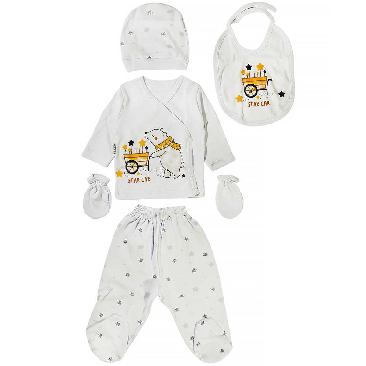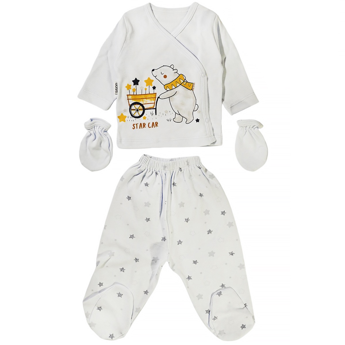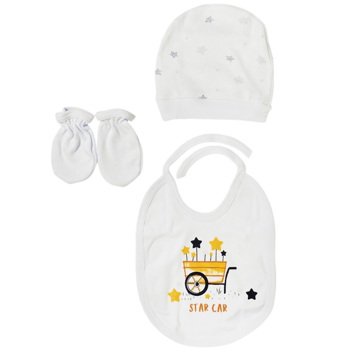 Ανακαλύψτε το βρεφικό σετ δώρου πέντε τεμαχίων Tiasis, ιδανικό για μικρά αγοράκια που θέλουν να ξεχωρίζουν με στιλ σε κάθε εμφάνιση! Το σχέδιο του σετ προσθέτει μία χαρούμενη νότα, ενώ η σύνθεση από 100% βαμβάκι εξασφαλίζει μέγιστη άνεση για το ευαίσθητο δέρμα του μωρού. Η μακρυμάνικη μπλούζα διαθέτει χαριτωμένο τύπωμα στο εμπρός μέρος και άνοιγμα με τρουκς στο πλάι, διευκολύνοντας την ένδυση. Το παντελόνι με «κλειστά ποδαράκια» και λάστιχο περιμετρικά στη μέση προσφέρει τέλεια εφαρμογή και ελευθερία κινήσεων. Η σαλιάρα που δένει με κορδόνι, το ασορτί σκουφάκι και τα γαντάκια νεογνού συμπληρώνουν ιδανικά το σετ. Αυτό το βρεφικό σετ είναι κατάλληλο για όλες τις εποχές, προσφέροντας στυλ και πρακτικότητα σε κάθε στιγμή!