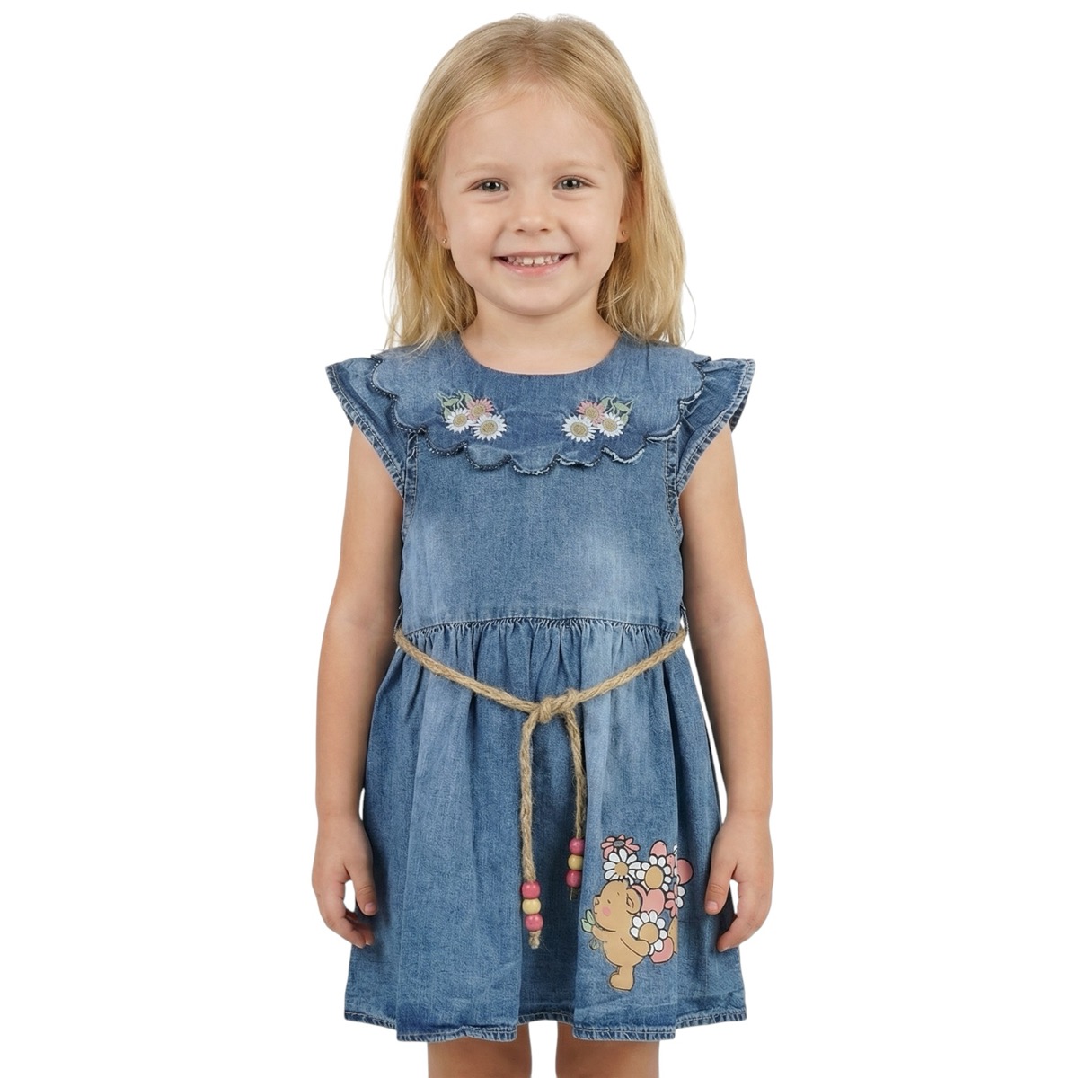 Ένα όμορφο φορεματάκι από τζιν βαμβακερό ύφασμα. Βολάν περιμετρικά στο λαιμό με όμορφα κεντητά σχέδια. Τύπωμα στο εμπρός μέρος. Άνοιγμα με κουμπιά στο πίσω μέρος. Ζώνη από σκοινί με χάντρες. Σύνθεση από 100% βαμβάκι.